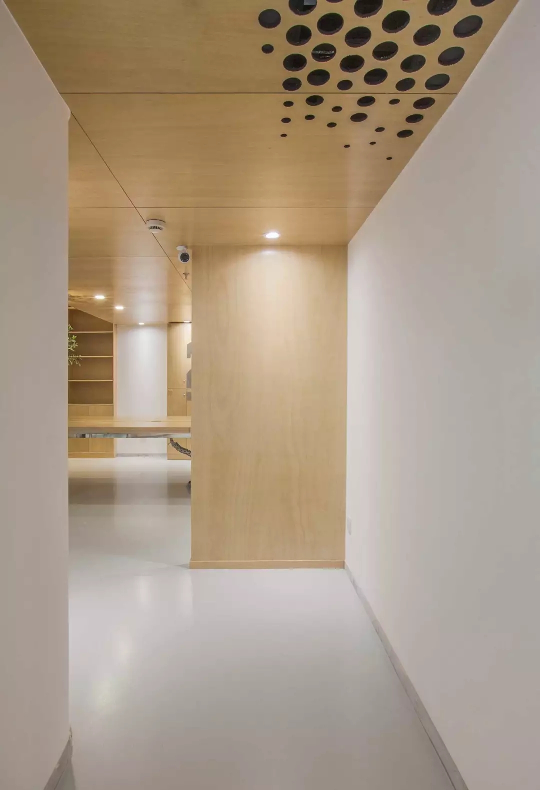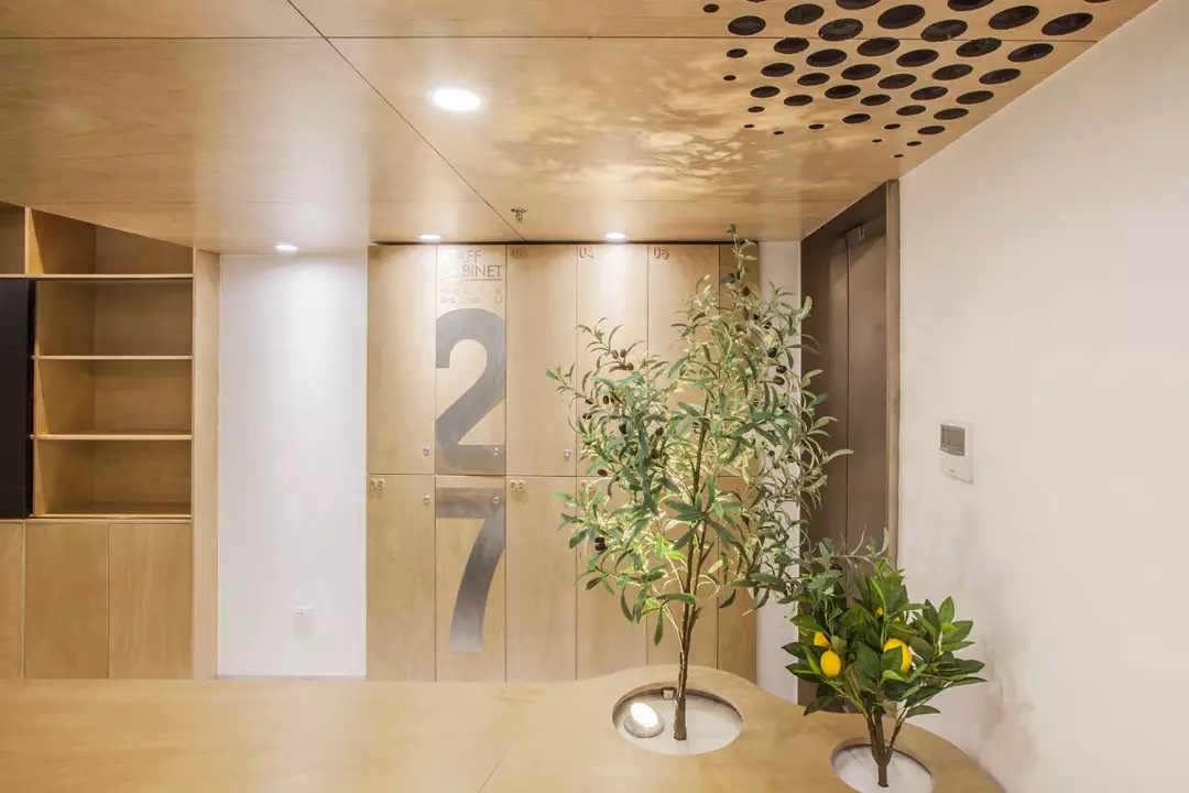 功能融于樂趣與創(chuàng)意,兩個空調的回風孔也不能放過,市面上的百葉口為了實用而完全無法融入環(huán)境。由于吊頂也屬于木質體塊,所以經過試驗,一個充滿漸變的點陣圖形,解決了這個問題,不同規(guī)格的開孔器進過精心布置并開洞,讓空間回歸純粹與樂趣。