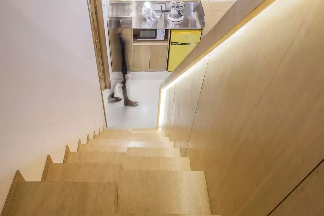 ▲交錯的樓梯節(jié)省了樓梯的長度,避開了頭頂的橫梁,順帶凹個造型