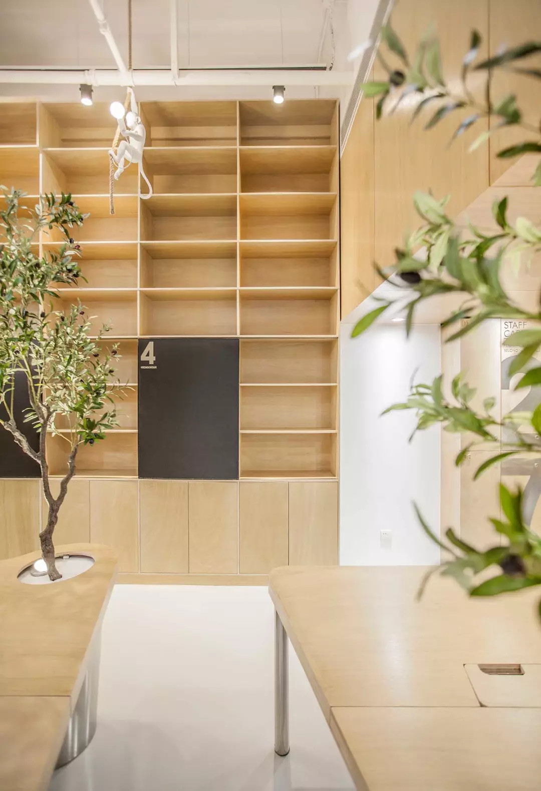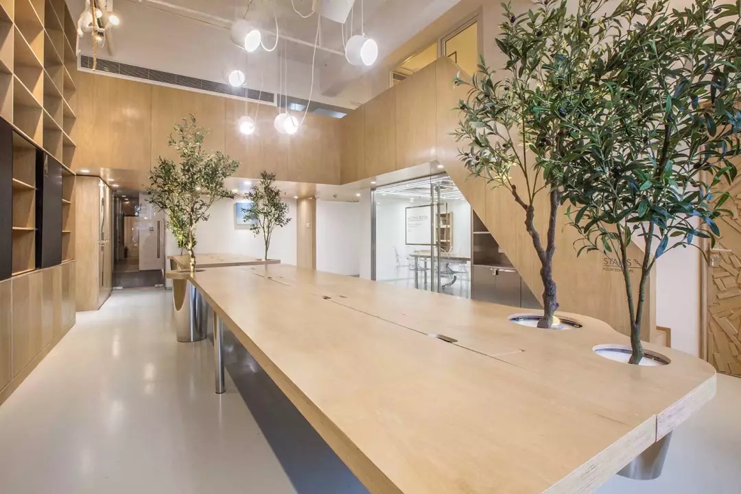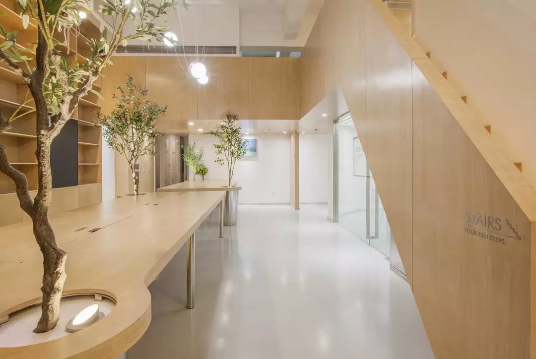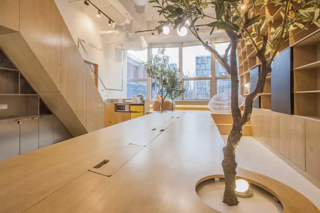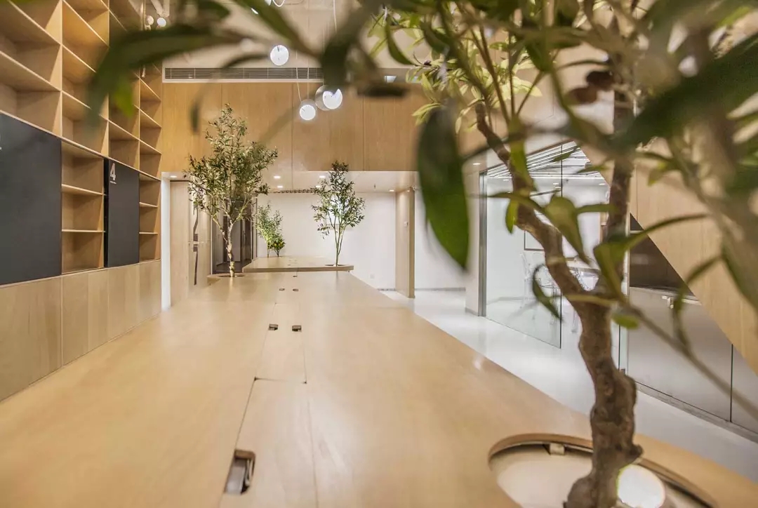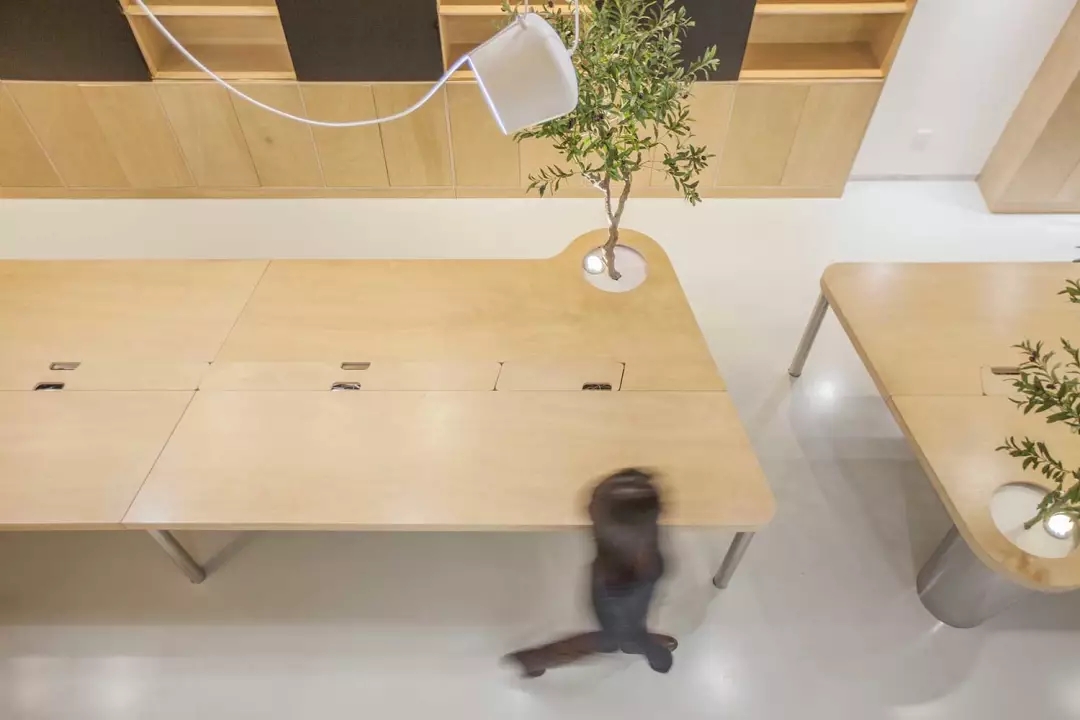 辦公桌與樹的結合,成為了整個空間的內景觀,也與外面的綠色形成呼應,消減以往辦公的緊張氛圍。整墻的書架也不甘無趣,在實用的框架下,產生一絲波動的起伏,如同山崖,如同坡面。