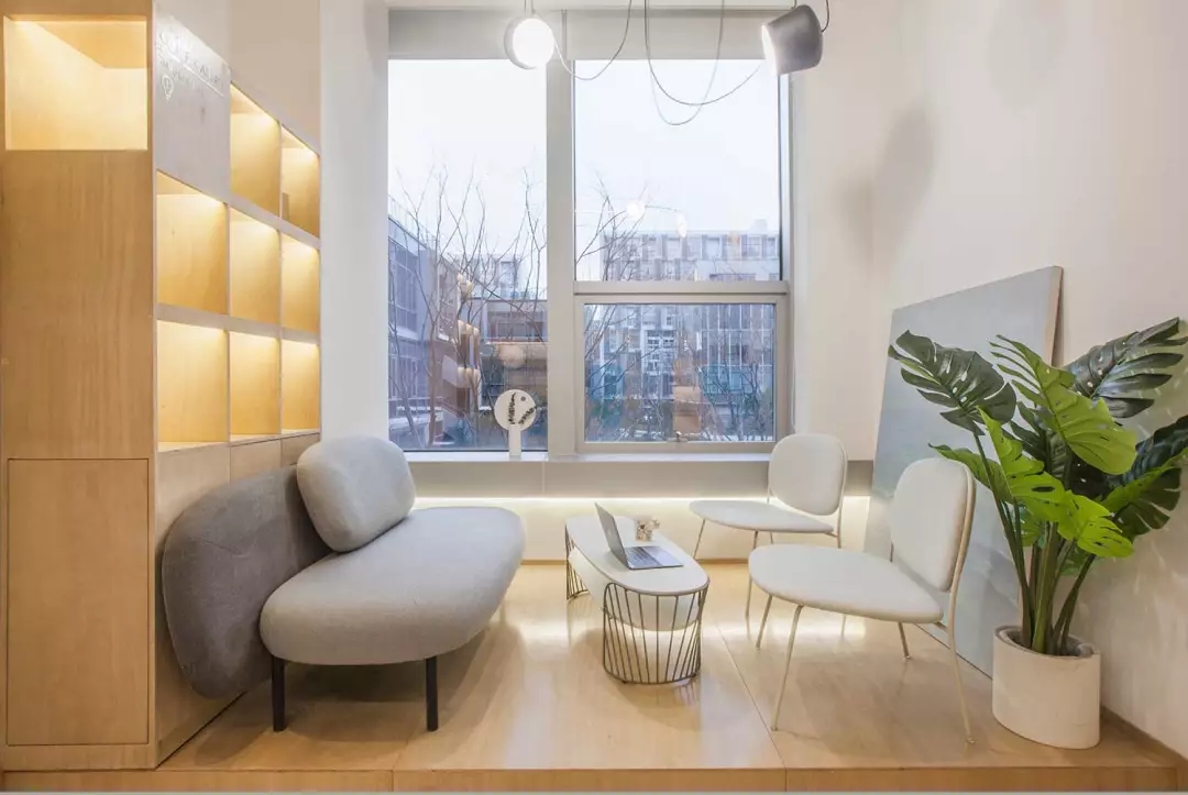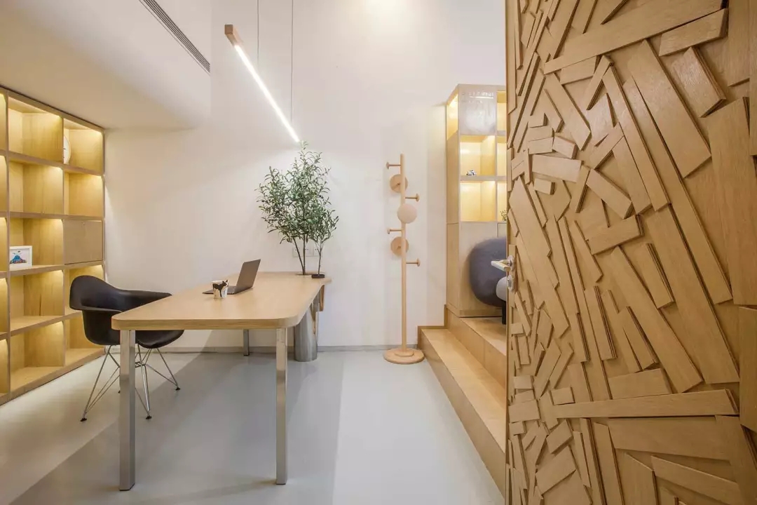 該項目位于上海市閔行區(qū)七寶萬科國際;我們希望工作室足夠的輕松、溫性、創(chuàng)意,于是通過顯性與隱性的符號對我們的目標進行構建;空間用了大量溫暖的木色,并組成木質的空間體塊,這些體塊以整個白色空間為背景,進行功能與空間節(jié)奏上的構筑: