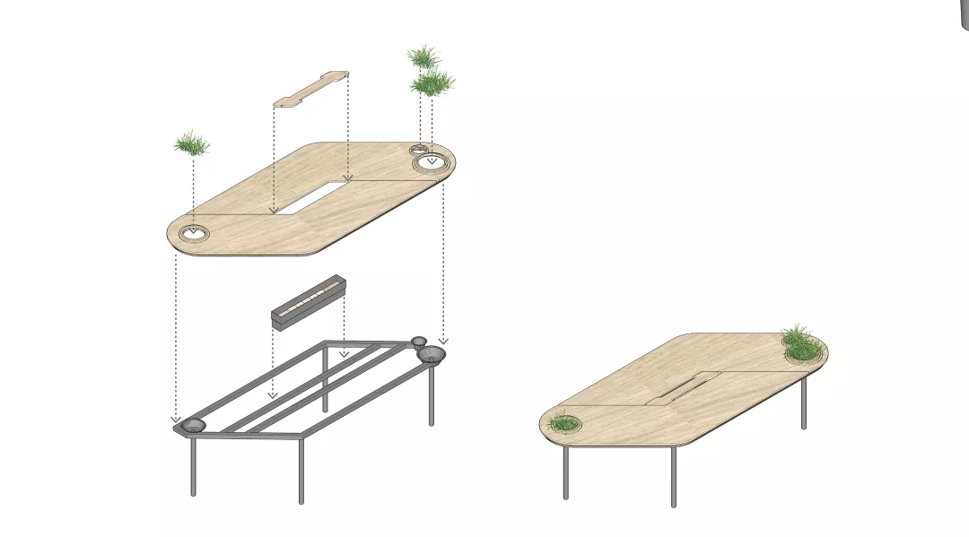 同時我們希望有一個張別具一格的會議桌,但是會議桌極強的功能性使得難以去進行改變。于是,會議室空間本身的形狀缺陷成了這張桌子想法的起點。由于避讓入口玄關,會議室空間有一個角是切掉的,墻壁是斜著放置,如果是長方形的會議桌,就必然在這個斜墻前造成使用空間不夠缺陷,無法坐人.所以就產生了一個平行四邊形的會議桌,斜邊與空間的斜墻平行,也讓整個斜墻前的空間可以坐下一個參會者,再嵌入一些小草,一張獨特又實用的會議桌就出來了。