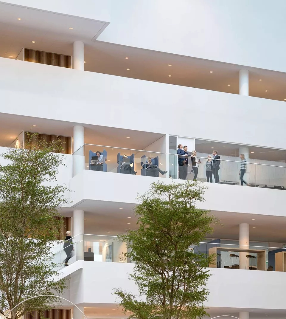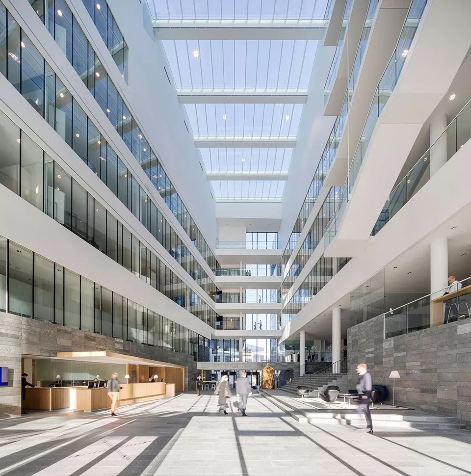 Nordea新總部擁有兩個(gè)令人難忘的中庭空間。其中一間為斯堪的納維亞半島最大的交易大廳,可容納 600名交易員,并可以觀賞到AmagerFælled的自然風(fēng)光。而另一間中庭則成為了客戶與員工之間的互動(dòng)場(chǎng)所。兩個(gè)中庭的區(qū)域讓建筑變得開(kāi)放自由,如同城市中的公共空間,人們?cè)谶@里相遇、共進(jìn)午餐以及參加非正式會(huì)議,同時(shí)也是各個(gè)部門(mén)開(kāi)展內(nèi)部活動(dòng)的好地方。