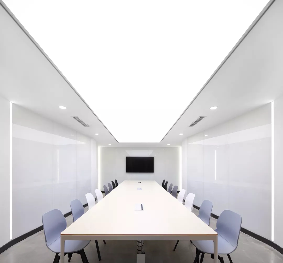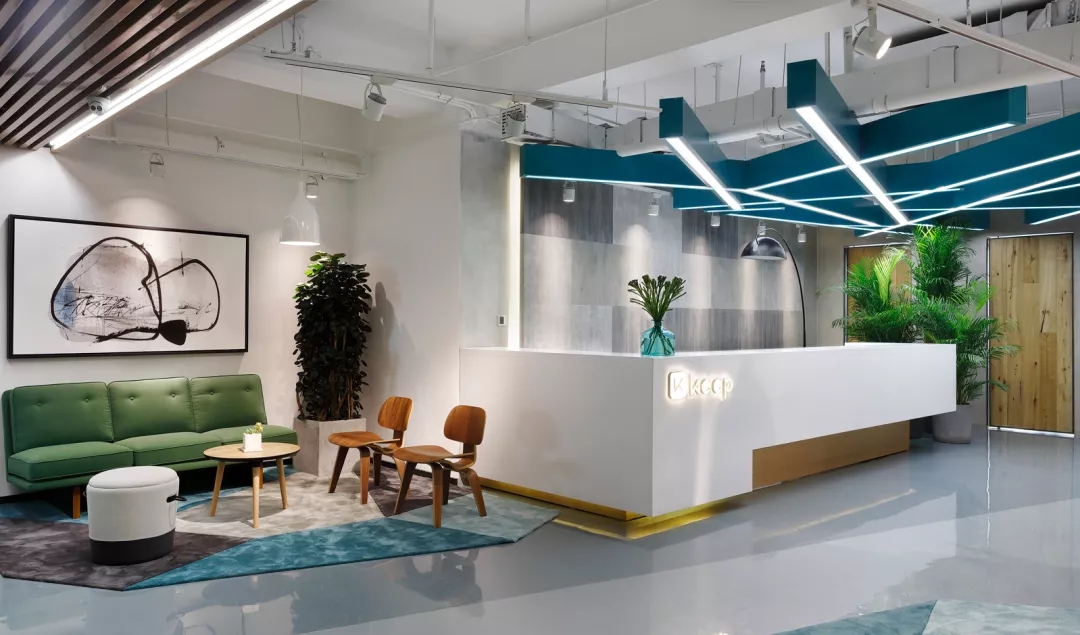 靠近電梯入口的前臺通過頂部的放射狀線條設計產生視覺延伸感,兩側區(qū)域通過軟裝陳設實現(xiàn)多層次的空間,靈活滿足接待、等候、會議及咖啡茶點的各種需求,員工和來訪人員各取所需互不干擾。