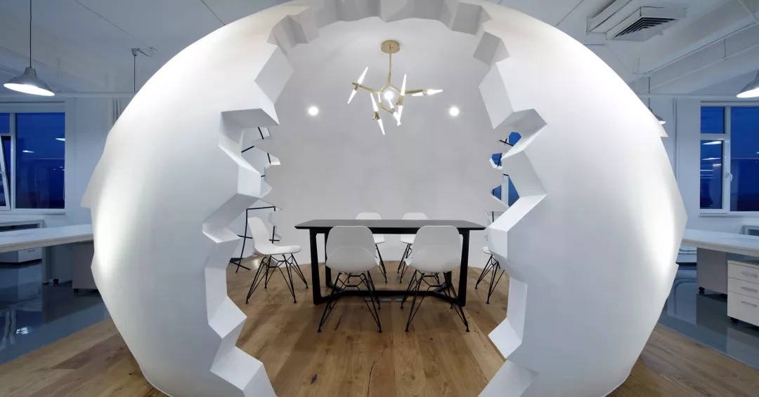 為了給開放式的辦公空間注入活力,我們在排排坐的工位場地正中設置了“破殼而出“的主形象——巨蛋討論區(qū),橢圓形的蛋壁實現(xiàn)攏音的隔音效果,兩側的鏤空引入自然光源,令這個裝置藝術般的討論區(qū)打破開放式工位的沉悶,成為視覺焦點。