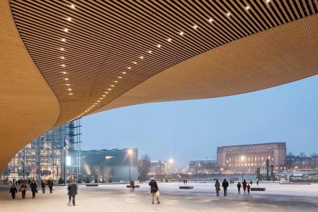 但其實(shí)據(jù)設(shè)計頌歌的主建筑師之一南安迪(Antti Nousjoki)講,靈感的出發(fā)點(diǎn),還是在于考慮它的功能。作為一個地處赫爾辛基市中心,毗鄰熱鬧商圈、火車站和美術(shù)館的公共空間,能夠給市民們帶來什么樣的服務(wù)?又能填補(bǔ)哪些缺失的城市設(shè)施?