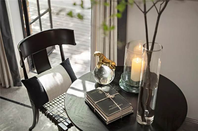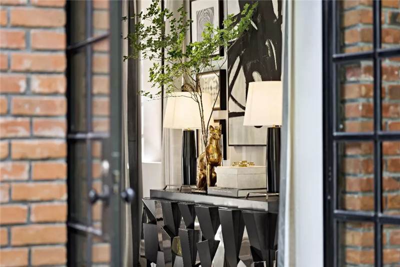 起居室背景展示墻,以混搭風(fēng)格鋪陳出洛普普的敘事展現(xiàn)。原始的羚羊頭飾,彷若征服野性蠻荒,象征勝利光輝。鑰匙是正在延續(xù)著的權(quán)勢(shì)標(biāo)志。設(shè)計(jì)師用跳色的編織盤(pán)與抽象藝術(shù)畫(huà)將微量的彩色疊加進(jìn)黑白灰的間隙中,呈現(xiàn)出別樣、細(xì)膩的風(fēng)情。而左下角的守護(hù)貓,一如埃及傳說(shuō)中神秘的幸運(yùn)守護(hù)者,正看顧著明亮通透的窗外,不斷朝曦夕映的美好時(shí)光。