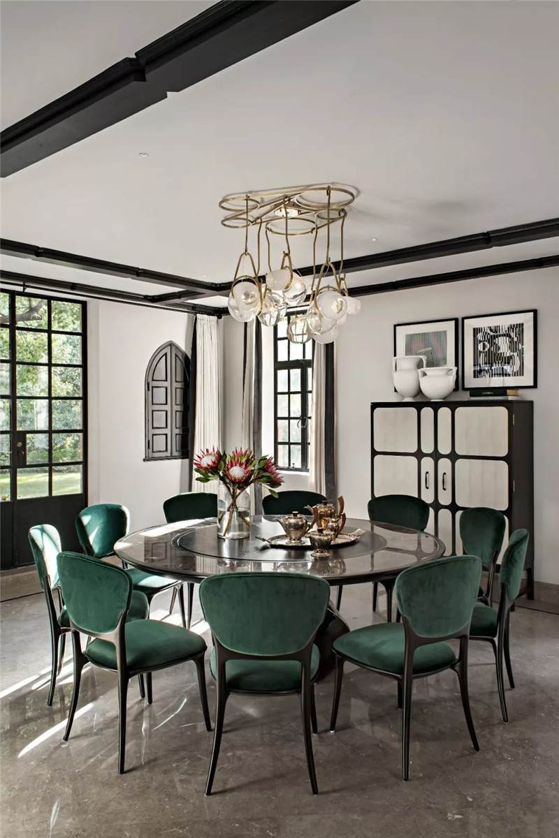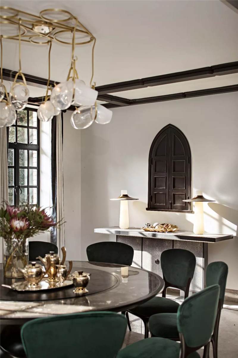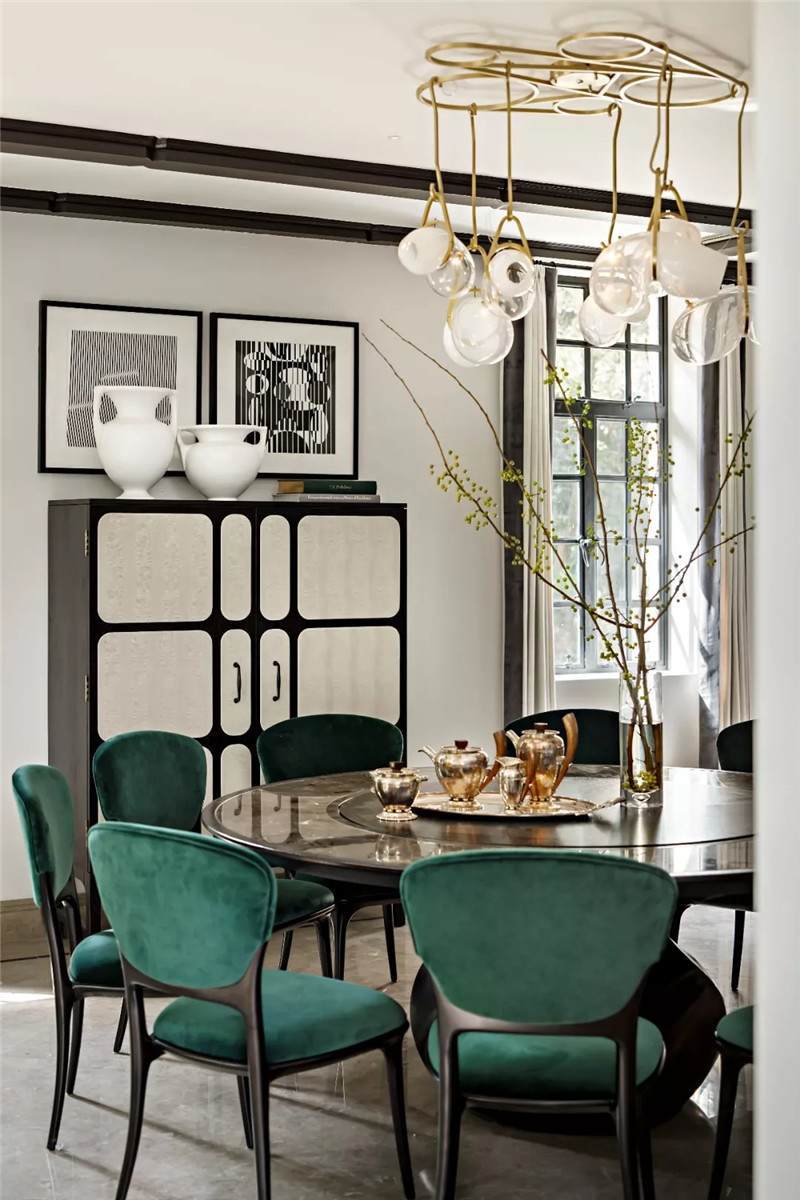 設(shè)計(jì)師在開(kāi)放式餐廳匯入尊貴的墨綠色,這也是拉斐爾前派畫(huà)家但丁·加百列·羅塞蒂畢生鐘愛(ài)的顏色。它溫情而清醇,神秘中帶著些許明朗,似幽深林間漫溢出的一屢清泉,在海派復(fù)古格調(diào)中自在游暢。