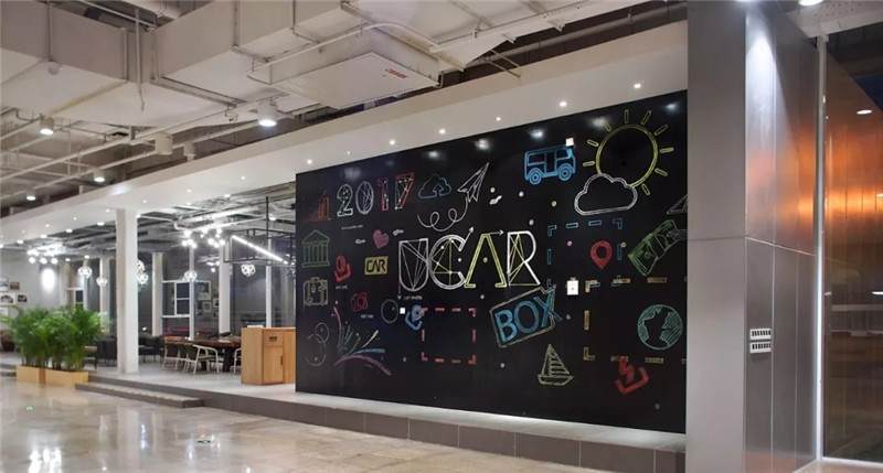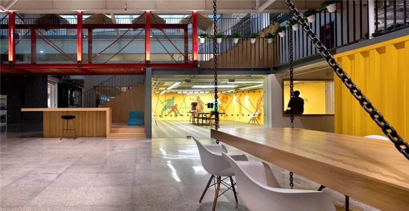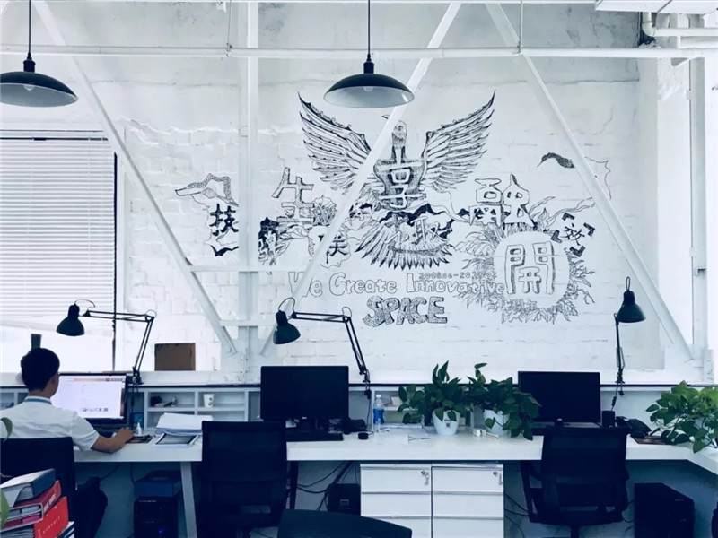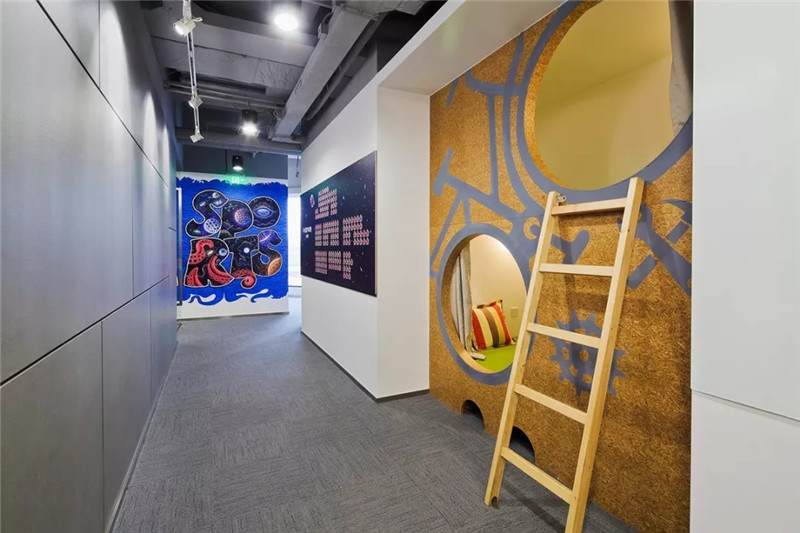 比如這張圖,也是華米科技北京的辦公室,用奧松板開兩個洞,精巧可愛的睡眠艙趴在墻上,利用兩個洞把它組成了自行車的輪廓,超萌的壁畫使墻面不再單一,色彩的對比更加直觀,同時用太空艙的形式增添趣味點,不論是做設計師還是做工匠,都要秉持設計的理念去進行選材和制造工藝,把握好每一個細節(jié)。