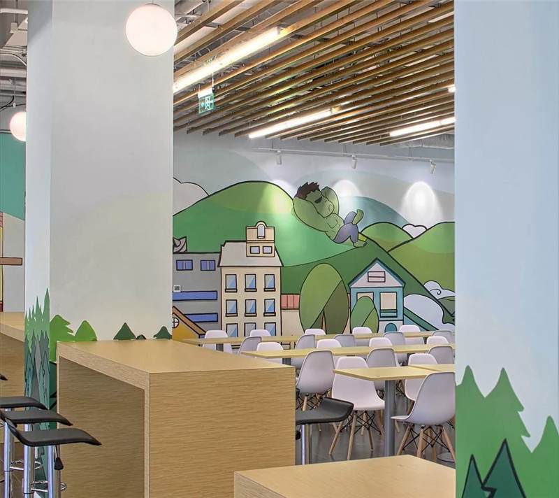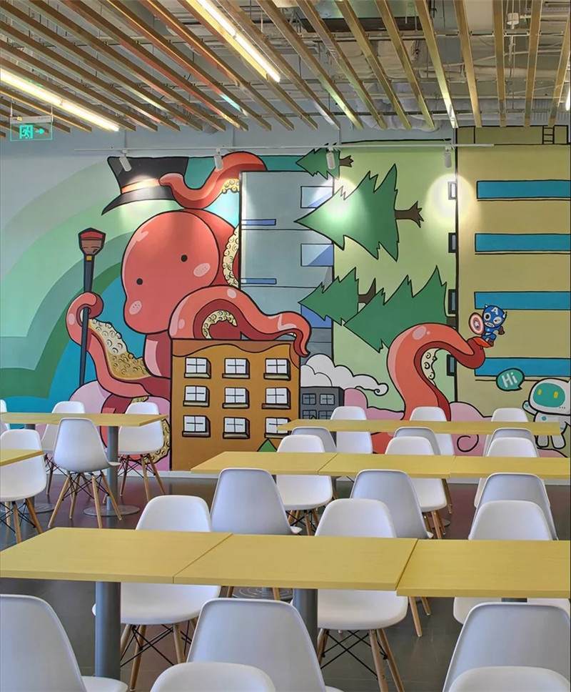空間氛圍不同,所以圖形裝飾也會因地制宜的改變,用暖色更動態(tài)的感覺。繪制的粉筆畫,可以定期的更換,像黑板報一樣制定不同的主題,它就是一面活的展示墻。