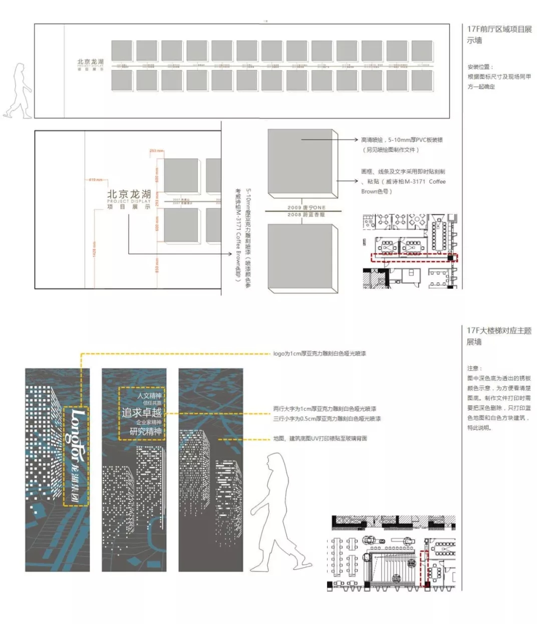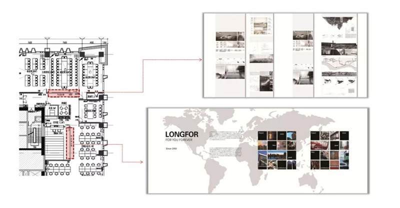 這一部分內(nèi)容跟展示設計相似,例如上圖,龍湖集團辦公室內(nèi)的一些項目展示團隊的建設,利用了大面積墻面上的空間進行了設計和制作。