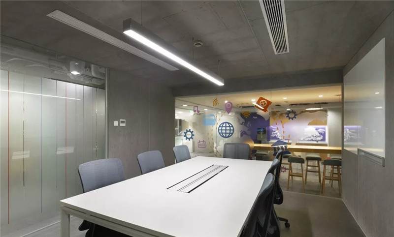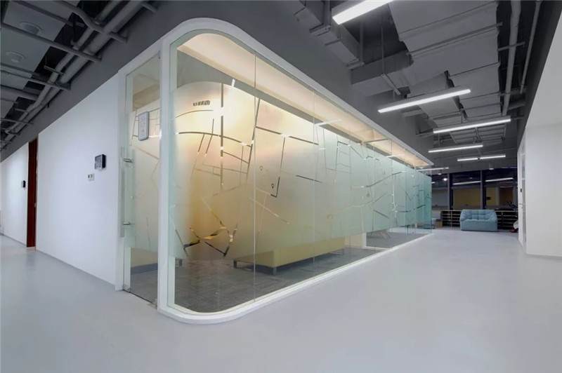 第二張中可以看到,桌上足球,這一張是會議室的玻璃貼膜,最初設計的都是一些彩色的圓點,但是做完后太通透,起不到遮擋作用,所以現(xiàn)場臨時在玻璃的內(nèi)側(cè)又加了大型的磨砂圓,就有兩層疊加到一起的圖形,磨砂與色彩組合在一起,效果豐富有層次。