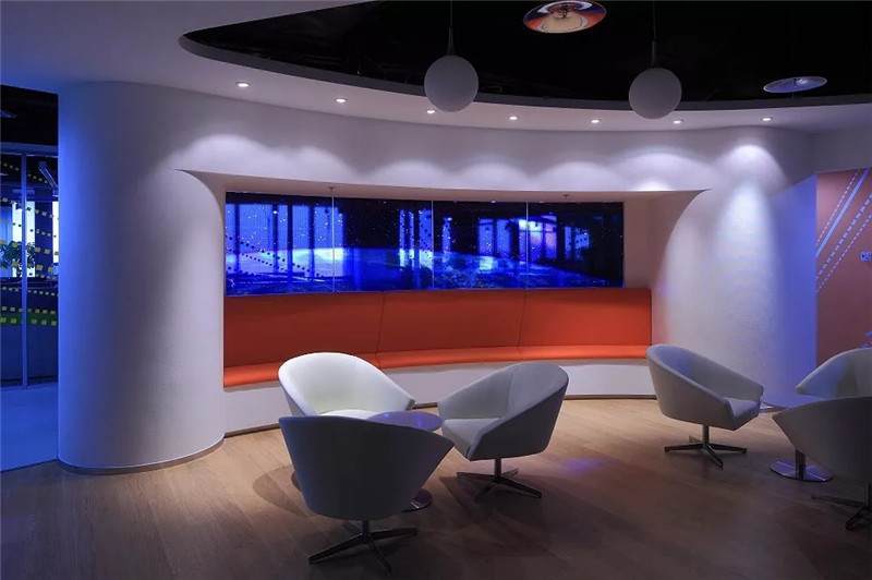 會議室電視的背景墻是手繪的墻面,弧形的玻璃采用了豎線稀疏的玻璃貼膜在起防撞的作用,同時與后面的大畫面也能產(chǎn)生一定的聯(lián)系。