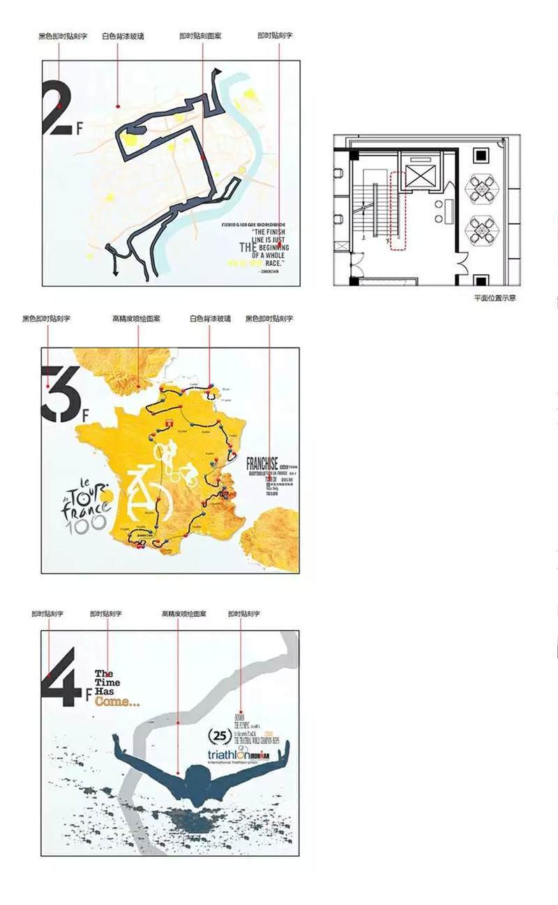 軟裝部分,這是幾層的設計稿,不同樓層的導視結(jié)合圖案以及主要的背景墻的主題。當時的設計文件實際的完成效果可以看出跟之前的設計稿基本上是完全一樣的,設計的時候也是因為都是用的矢量文件1:1的設計小稿,所以能保證完成后的效果。