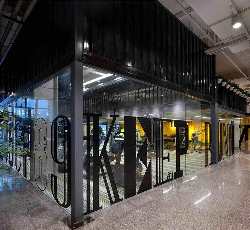 整體空間設計多層次,所以它的貼膜采用黑色字母來呈現(xiàn)健身區(qū)的氛圍。