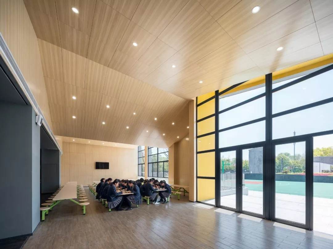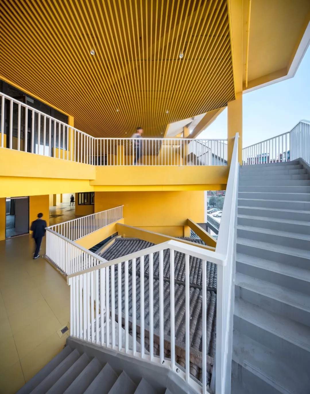 校園首層裙房的折面屋頂鋪滿了小青瓦,是中國(guó)傳統(tǒng)建筑中最常見的一種材料之一。從上層建筑向外眺望就可以看到,瓦片不僅起到建筑屋面保溫防水的作用,還為整個(gè)校園帶來了一份優(yōu)雅和淡然。