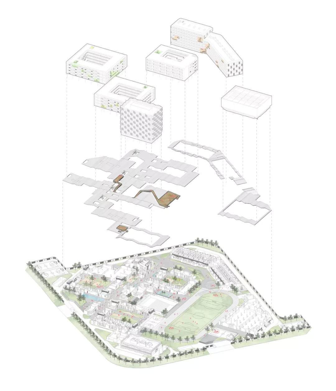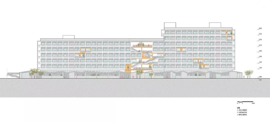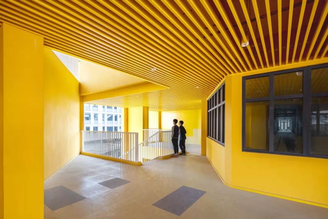 此外,設(shè)計(jì)在教室與地面集中活動(dòng)場(chǎng)地之間創(chuàng)造了中間層級(jí)的活動(dòng)場(chǎng)地,讓課間短暫的時(shí)間也能讓學(xué)生充分玩耍。把教學(xué)樓和宿舍樓局部的體塊掏空形成半開放的活動(dòng)空間,將掏空與開洞這種二維的建筑元素增加了一維,表面上看是把原有的實(shí)體空間減少了一部分,實(shí)則掏空的部分成為了學(xué)生課外活動(dòng)、接觸自然的場(chǎng)所,增加了整體空間的豐富程度,反而達(dá)到了100-1=101的效果。并且,活動(dòng)空間被設(shè)計(jì)為統(tǒng)一的明黃色,配合午間陽(yáng)光的光影效果,為校園增添活力的同時(shí)增強(qiáng)辨識(shí)度與歸屬感,促進(jìn)學(xué)生們的溝通交流。