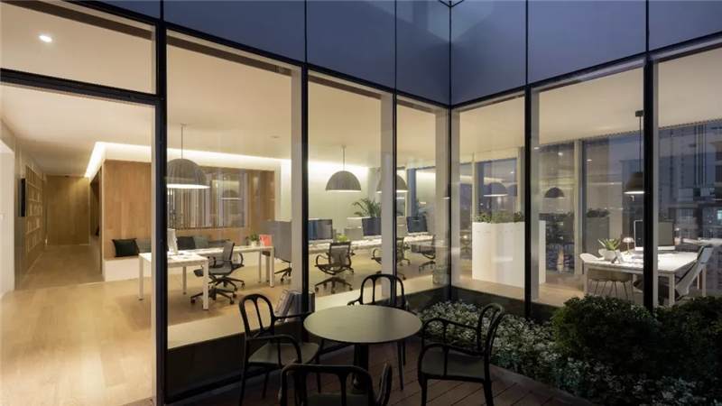 于是在空間設(shè)計(jì)上,盡量打破室內(nèi)外空間的界限,內(nèi)與外的空間景致相互流通。地下一層為洽談?wù)故究臻g,室外為下沉庭院。大面積玻璃的運(yùn)用,將庭院景觀引入室內(nèi)。并將通向一層大堂的樓梯,設(shè)計(jì)成朝向庭院開敞的大樓梯,可停留、可休憩,可觀賞與感受庭院的景致、光影的變化。而在四層和五層,則借鑒嶺南建筑中的天井院落空間,設(shè)計(jì)一個(gè)貫通兩層的屋頂采光中庭——天光從上流瀉而下,灑在四層中庭的景觀樹上、滿溢在空間中,使室內(nèi)產(chǎn)生一種宛若室外庭院的錯(cuò)覺。