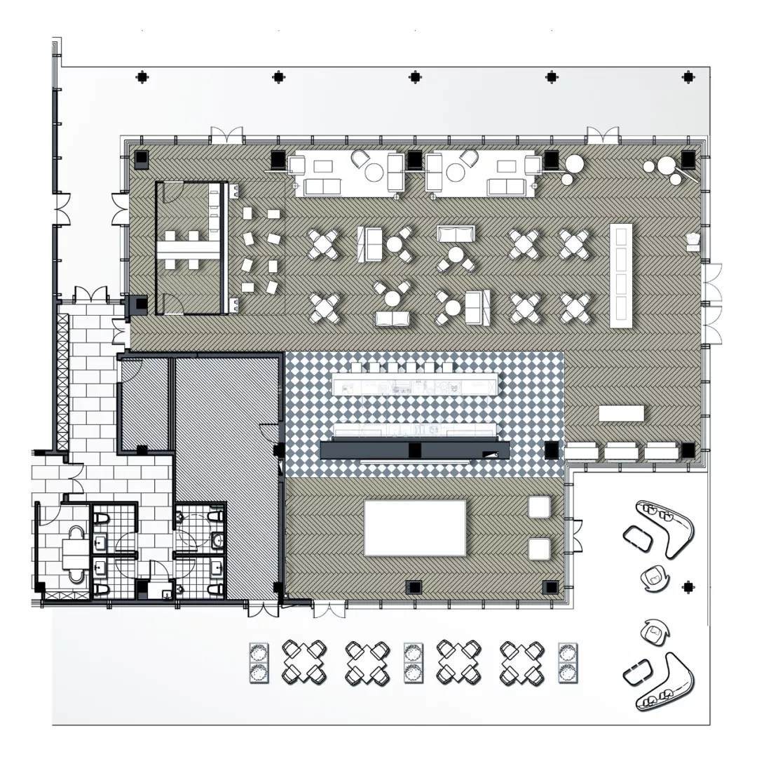 空間中所有符號語言均是設(shè)計的表象表達(dá),與其深邃豐富的內(nèi)在視像緊密相連。未經(jīng)修飾的混凝土、鋼材料與金屬組件透露出粗獷與質(zhì)樸的氣質(zhì),長條燈飾融進(jìn)鐵藝管道的線條穿插中,以光影效果加強(qiáng)幾何美學(xué)里的明暗層次,在硬朗中體現(xiàn)熱情與溫暖,點(diǎn)染酒吧一隅的休閑氛圍。