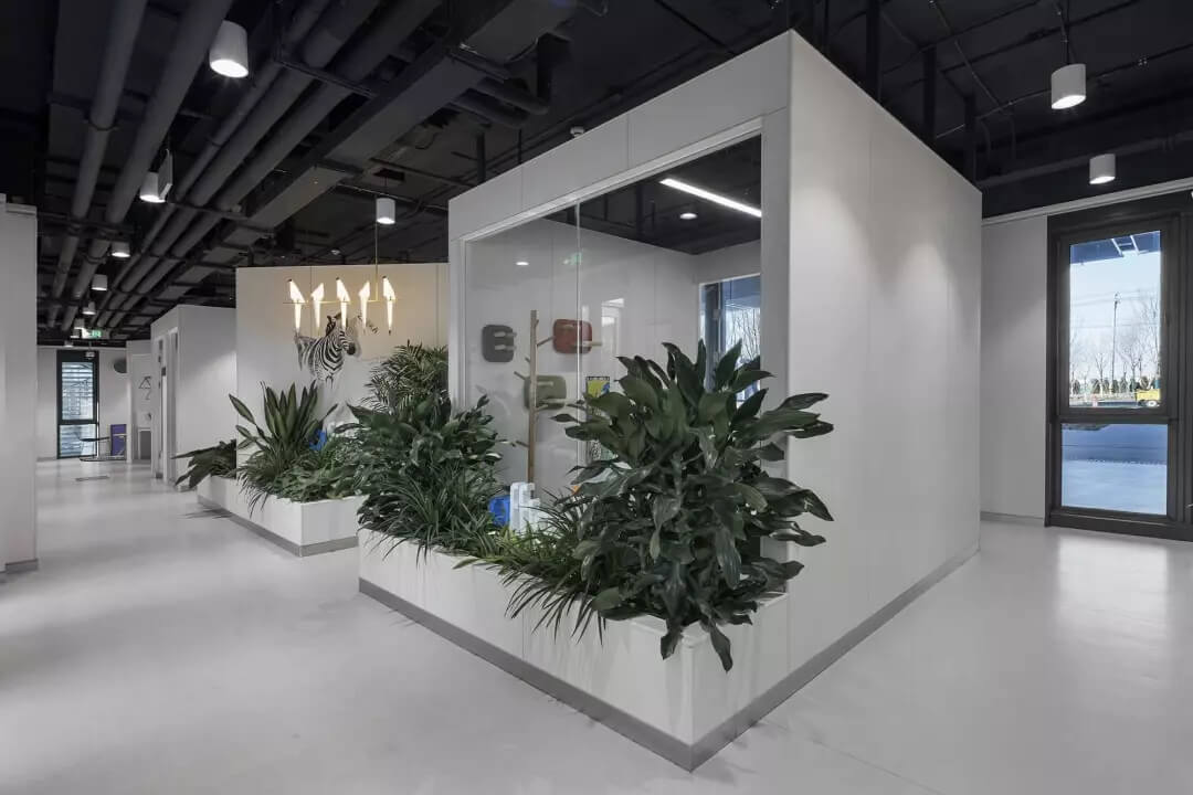 我們選擇在溫潤(rùn)的木質(zhì)和清冷簡(jiǎn)約的現(xiàn)代工業(yè)風(fēng)兩個(gè)主打風(fēng)格中做嵌入融合,將形色各異的綠植以碎片化環(huán)繞的方式呈現(xiàn),讓人有種綠意悄然邂逅的驚喜。于是設(shè)計(jì)了以?xún)扇宋粸橐唤M的多個(gè)盒子空間,讓綠植棲息環(huán)繞,使每個(gè)組團(tuán)都能隨時(shí)與自然互動(dòng),汲取靈感,巧妙形成建筑中的小建筑。