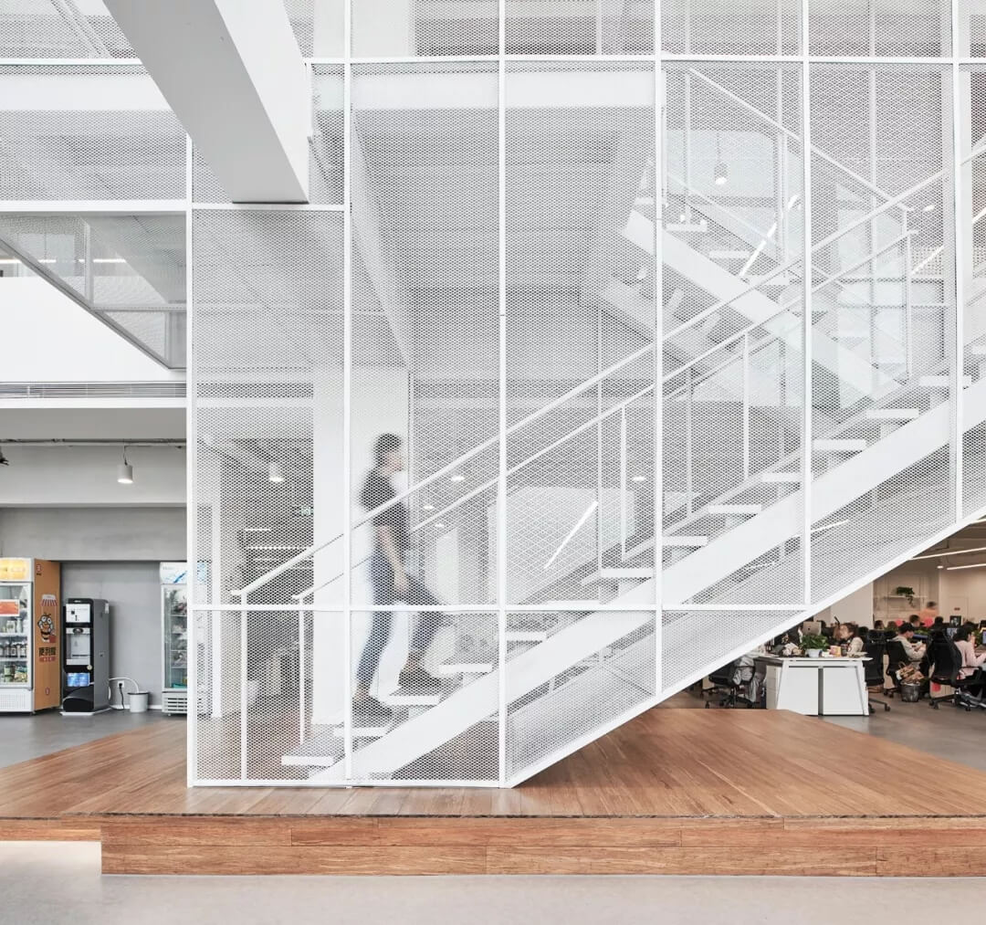 游廊藝谷島,設(shè)計師用鋼網(wǎng)構(gòu)筑出具有雕塑藝術(shù)感的包裹樓梯空間,通透性的白色鋼網(wǎng),簡單時尚,加強與空間的融合。