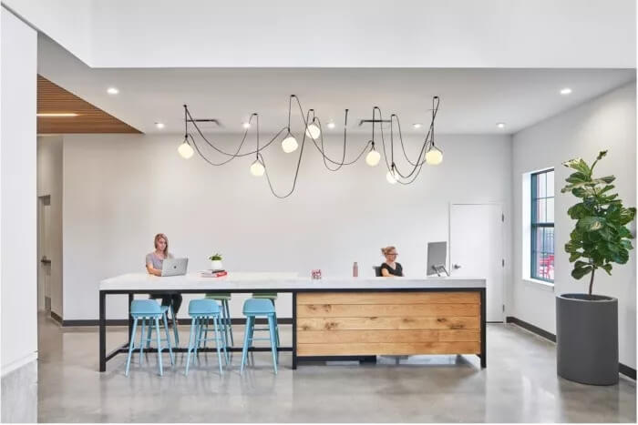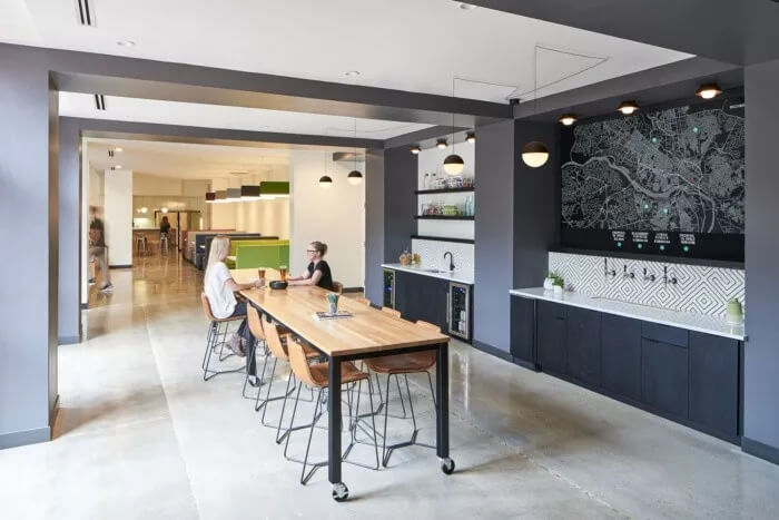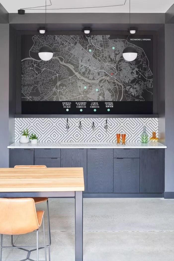 曾經(jīng)被濫用的中庭被重新構(gòu)想成該機(jī)構(gòu)的心臟-充滿活力的會議區(qū)和一間酒吧,設(shè)有來自里士滿地區(qū)的旋轉(zhuǎn)水龍頭。大堂取代了傳統(tǒng)的bun堡般的接待臺和獨(dú)立的休息區(qū),而是變成了一個(gè)畫廊—充滿活力,動(dòng)感十足,并嵌入了里士滿的性格。還有接待處?那個(gè)也被定制的鋼制桌子代替,該桌子可以兼作員工的共同工作空間。