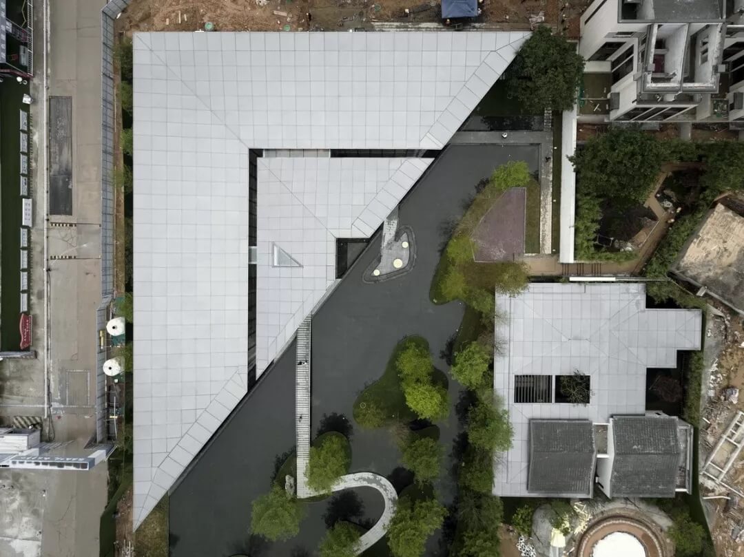同時(shí),整個(gè)建筑運(yùn)用了現(xiàn)代構(gòu)圖的方式,突破了傳統(tǒng)對(duì)稱(chēng)的客家建筑特征,將多個(gè)同心半圓演化成多個(gè)相似三角形,構(gòu)成了不對(duì)稱(chēng)的幾何空間;巧妙地通過(guò)線與面的緩急對(duì)比加強(qiáng)了視覺(jué)上的層次感,以不同的設(shè)計(jì)手法,在保持建筑與外部交匯貫通的關(guān)系的同時(shí),強(qiáng)化了建筑的縱深感。