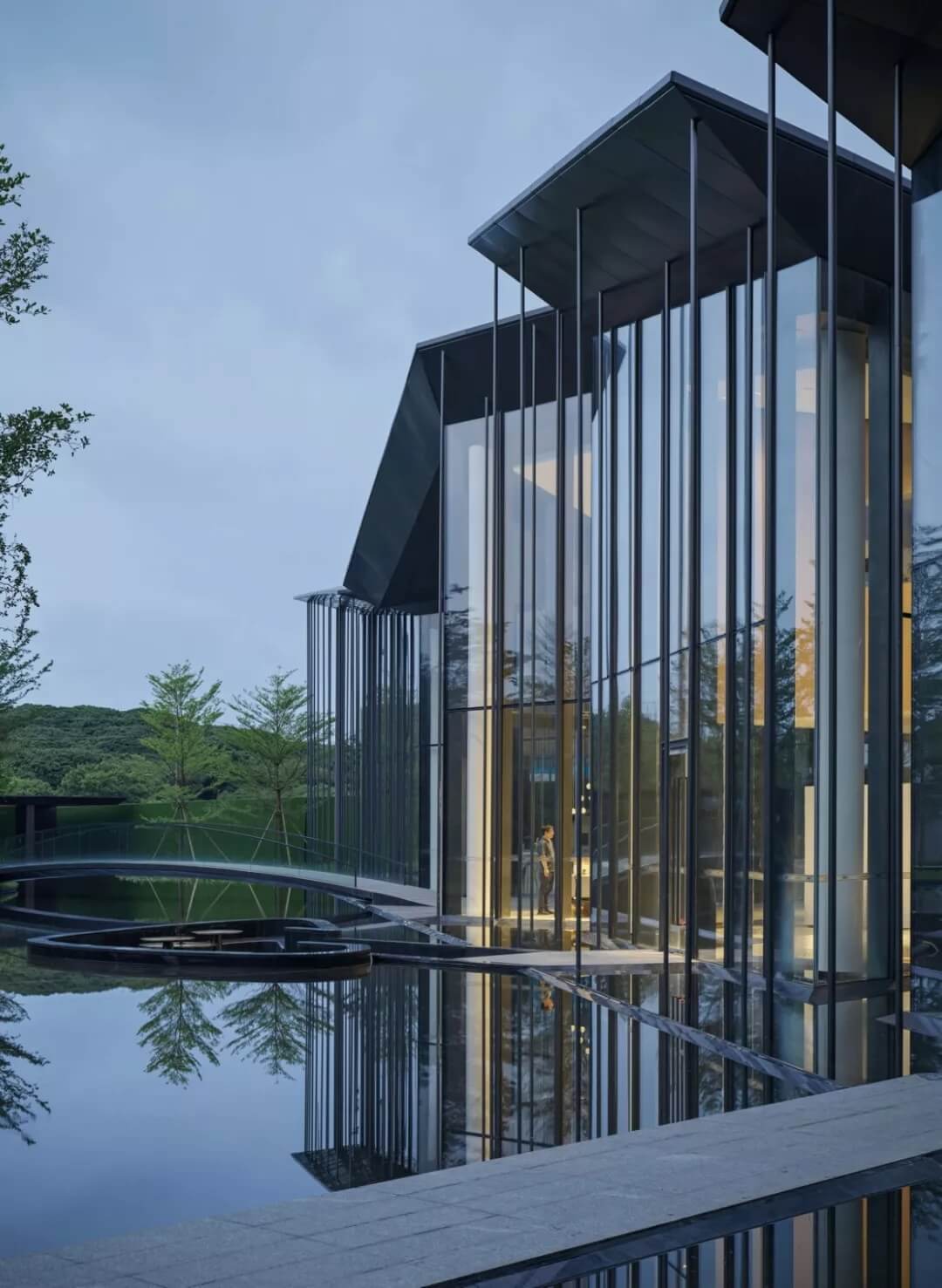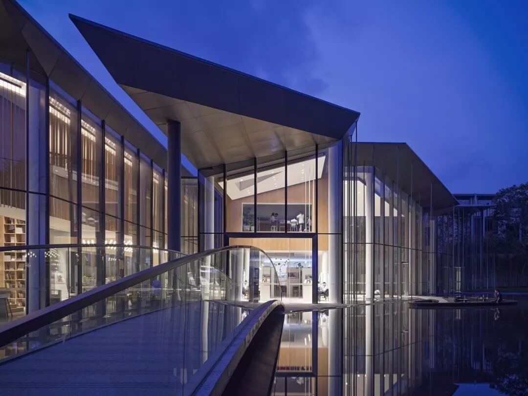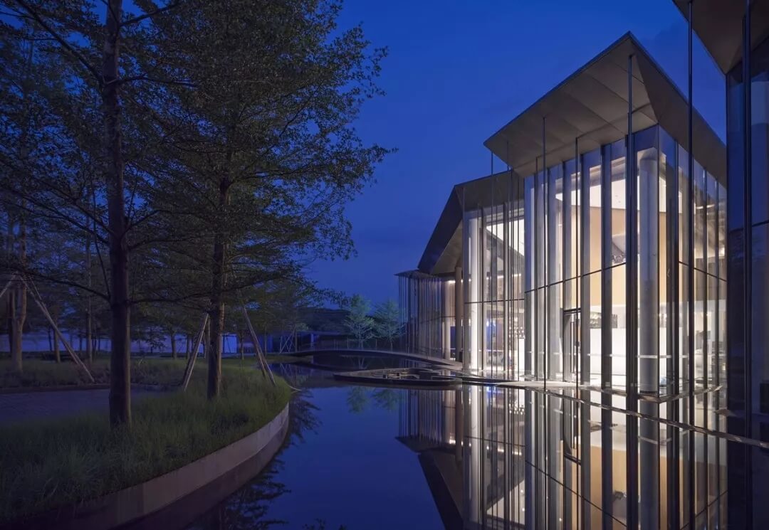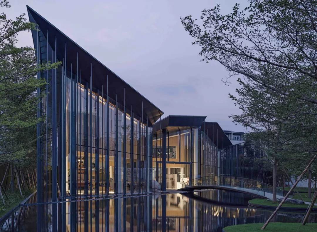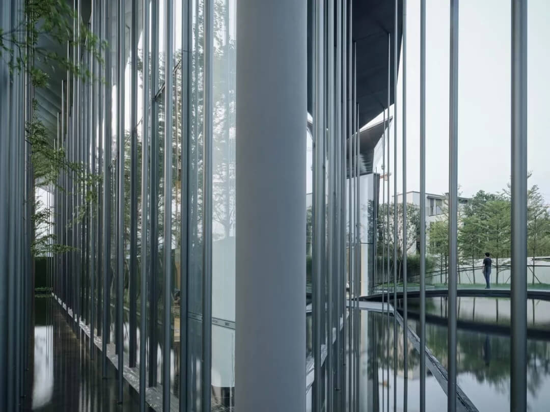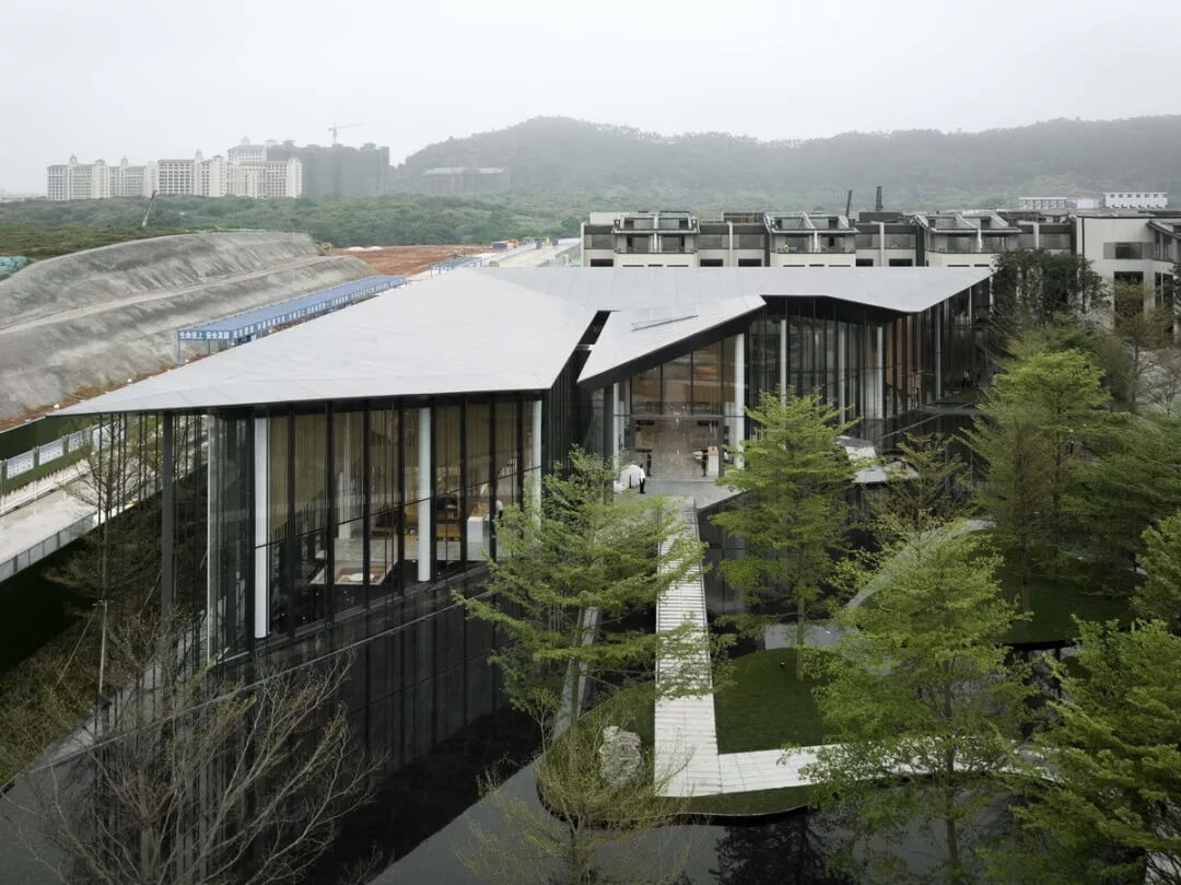 在這個(gè)項(xiàng)目中,建筑師嘗試用現(xiàn)代的理念、結(jié)構(gòu)和材料來(lái)打造由封閉走向開(kāi)放融合的客家建筑,創(chuàng)造出傳統(tǒng)文化和現(xiàn)代觀念相結(jié)合的建筑形態(tài)。如同客家建筑大多坐落于山水樹(shù)林間,這座雙層建筑與周?chē)匀痪坝^也保持著親密聯(lián)系。剪影式的三角形頂棚如同山的影子般遮蓋著地面;而支撐著整個(gè)三角屋頂?shù)慕饘僦韧鹑裘艿臉?shù)林,與戶外的樹(shù)木連成一片;環(huán)繞場(chǎng)地的水景弱化了由剛性的幾何平面帶來(lái)的疏離感,大面積的玻璃的應(yīng)用,引入周?chē)G色景觀,重新定義了建筑與周邊的環(huán)境關(guān)系。莊重但不厚重的頂棚,高聳錯(cuò)落的柱廊,通透的落地玻璃,山與樹(shù)與水。