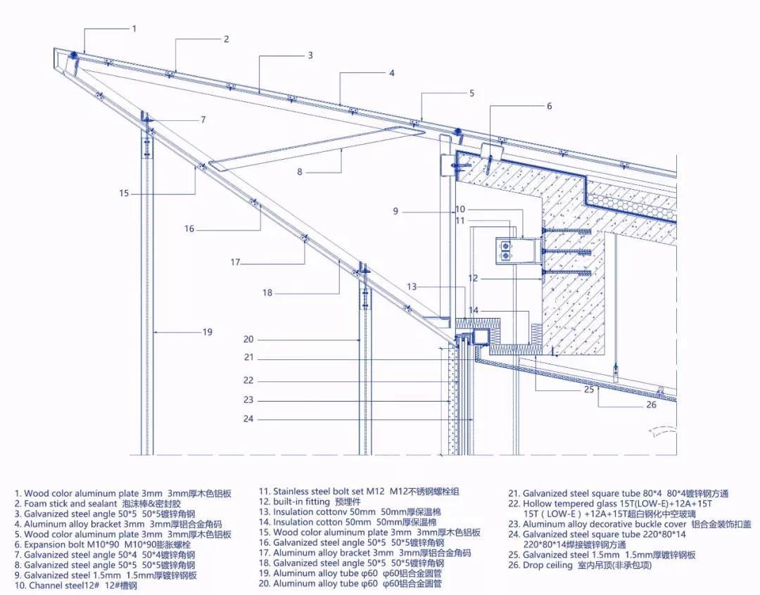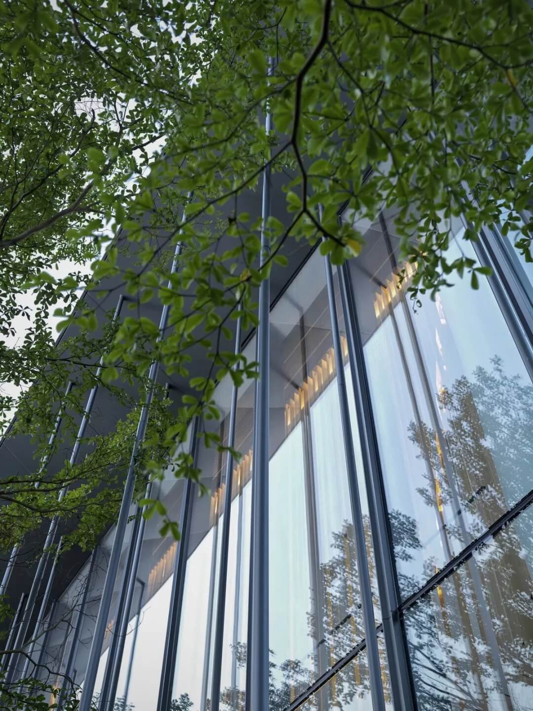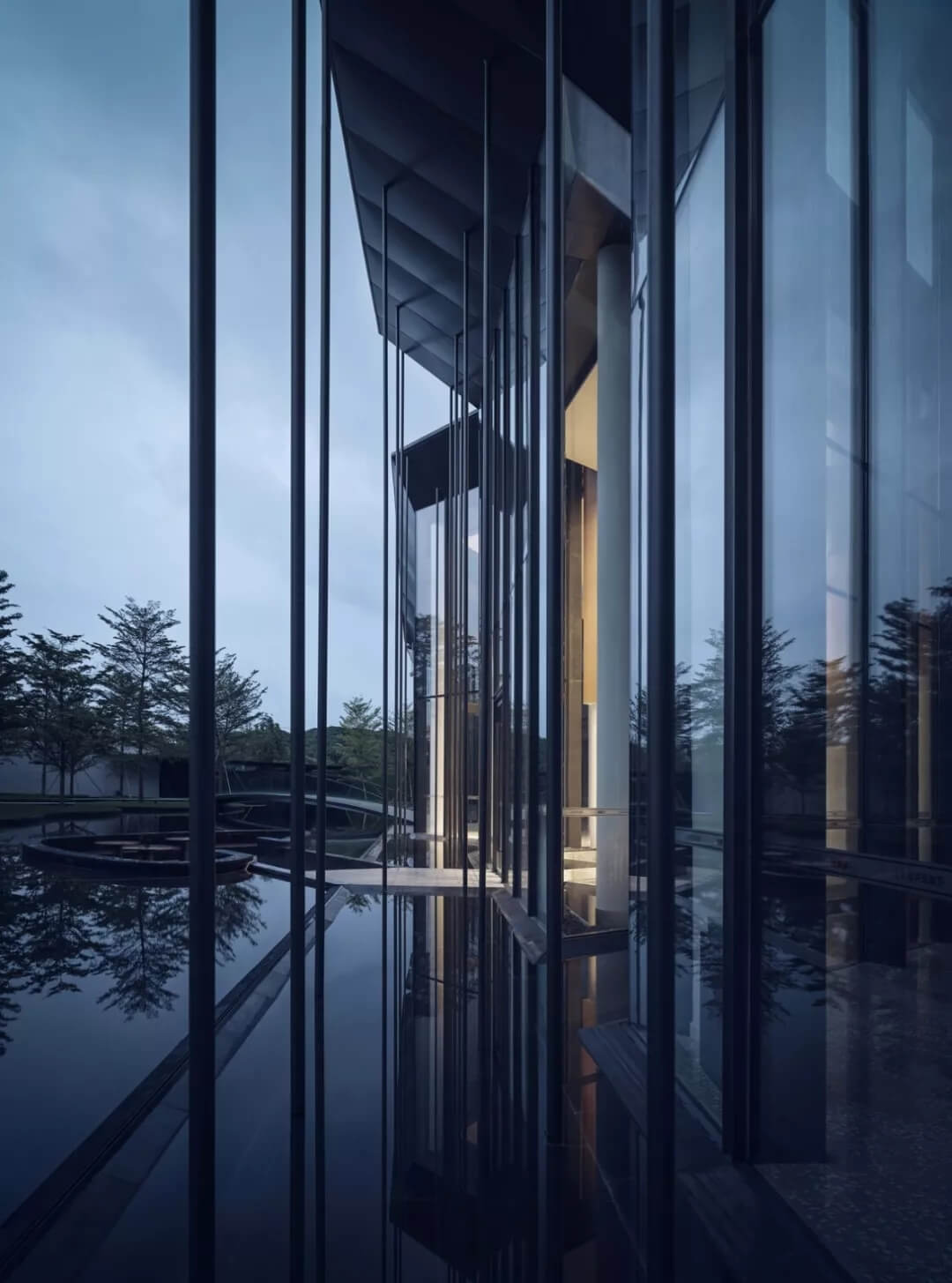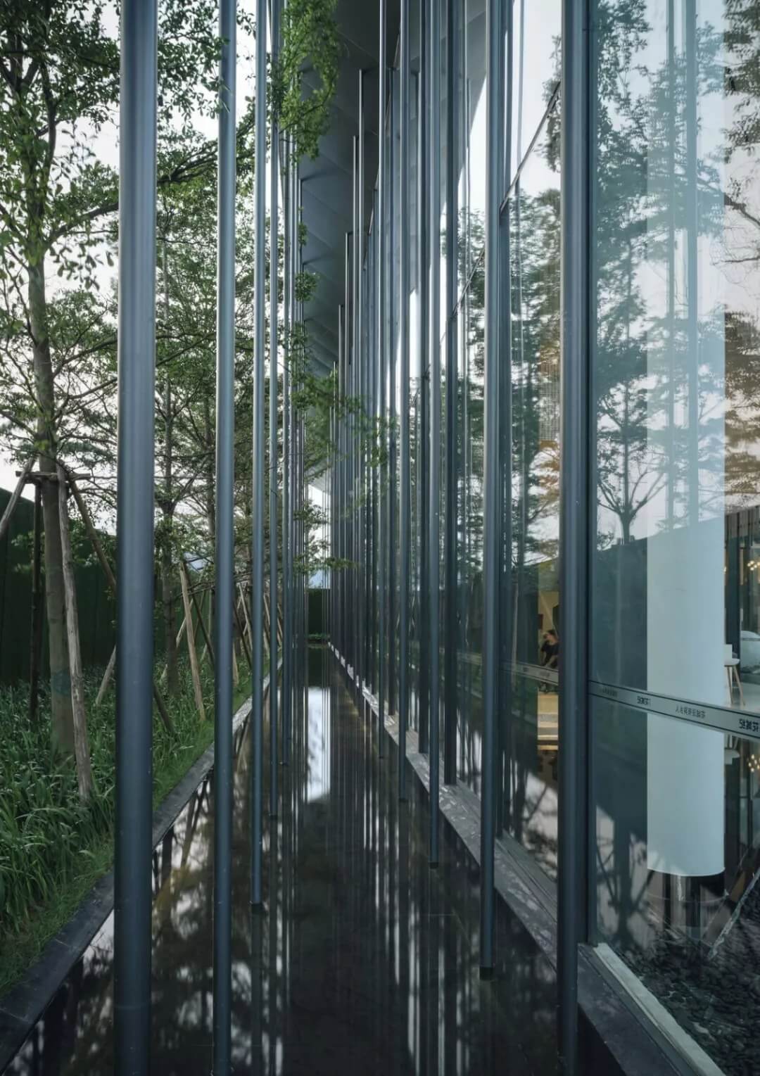 在這個(gè)項(xiàng)目中,建筑師嘗試用現(xiàn)代的理念、結(jié)構(gòu)和材料來(lái)打造由封閉走向開(kāi)放融合的客家建筑,創(chuàng)造出傳統(tǒng)文化和現(xiàn)代觀念相結(jié)合的建筑形態(tài)。如同客家建筑大多坐落于山水樹(shù)林間,這座雙層建筑與周?chē)匀痪坝^也保持著親密聯(lián)系。剪影式的三角形頂棚如同山的影子般遮蓋著地面;而支撐著整個(gè)三角屋頂?shù)慕饘僦韧鹑裘艿臉?shù)林,與戶外的樹(shù)木連成一片;環(huán)繞場(chǎng)地的水景弱化了由剛性的幾何平面帶來(lái)的疏離感,大面積的玻璃的應(yīng)用,引入周?chē)G色景觀,重新定義了建筑與周邊的環(huán)境關(guān)系。莊重但不厚重的頂棚,高聳錯(cuò)落的柱廊,通透的落地玻璃,山與樹(shù)與水。
