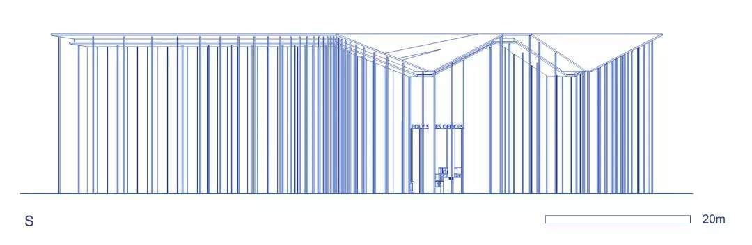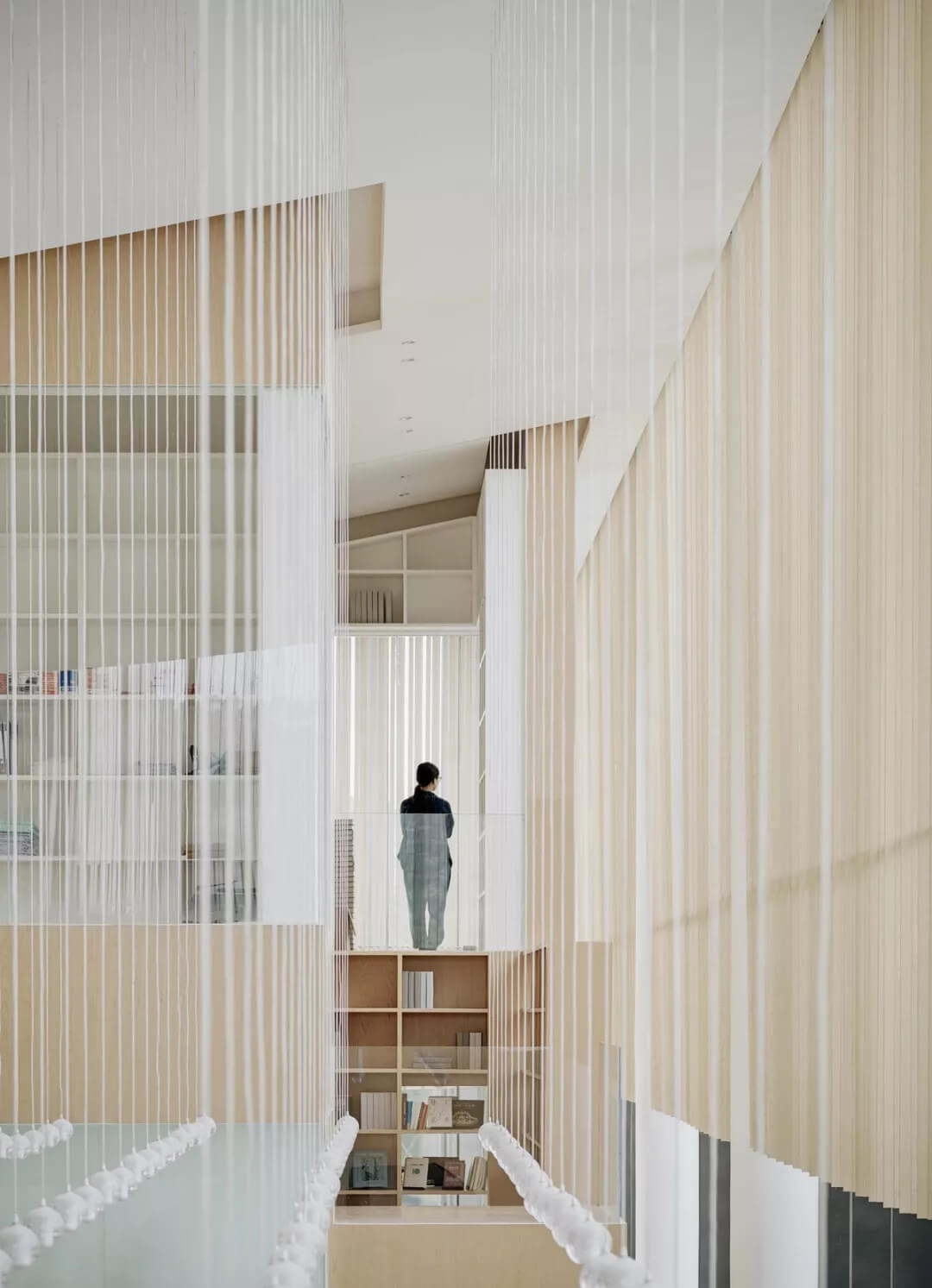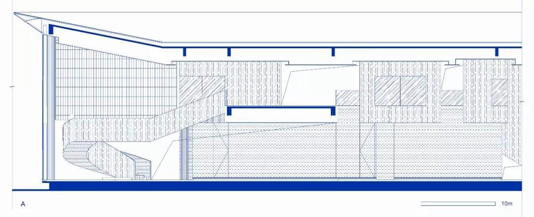 為了適應(yīng)當(dāng)?shù)貧夂?,建筑師在南翼雙層通高的開(kāi)敞空間內(nèi)設(shè)置了懸垂的木隔柵,可以達(dá)到舒適的遮陽(yáng)效果,并且具有空間劃分的功能。公共洽談區(qū),雙層書(shū)架,咖啡吧就位于此。平行垂落且錯(cuò)落的木隔柵打破了安靜的空間氛圍,和室外的廊柱相互呼應(yīng)的同時(shí),密布的木隔柵也自身形成體量與二層的功能體塊虛實(shí)相生。