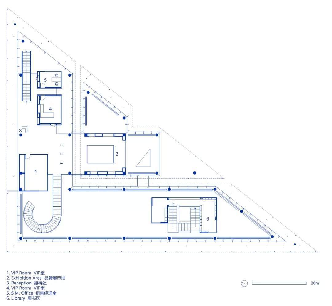 懸挑的頂棚引導(dǎo)游客進(jìn)入建筑內(nèi)部,映入眼簾的是錯(cuò)落分布著木質(zhì)懸浮盒子的雙層十米挑高空間。同時(shí)大面積的玻璃幕墻營(yíng)造的通透感,使得無(wú)論哪個(gè)方位,都具有內(nèi)外空間相通的視覺(jué)體驗(yàn)。隱藏在水池中的下沉休息區(qū),懸掛在天花上的木隔柵,穿插在旋轉(zhuǎn)樓梯和書(shū)架之間的休閑洽談區(qū),還有較為隱蔽私密的二層貴賓室,多個(gè)不同功能的空間仿佛彼此獨(dú)立,卻又渾然一體。
