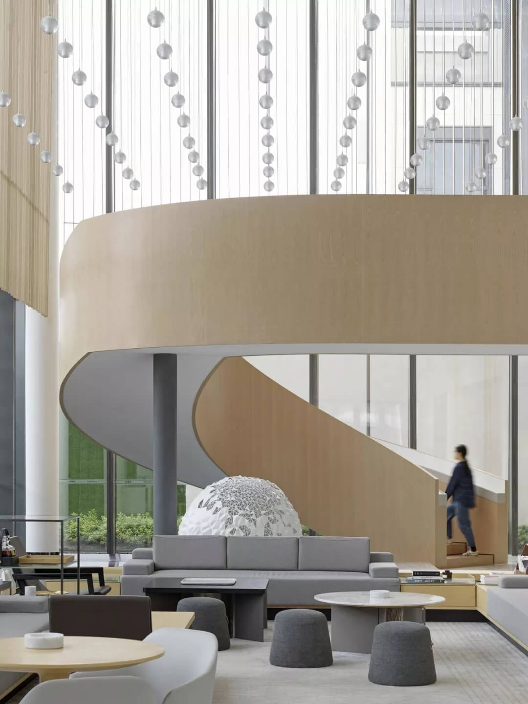 主要的休閑洽談區(qū)域通過(guò)強(qiáng)調(diào)垂直上的縱深感和透明度,營(yíng)造出一種平穩(wěn)而開(kāi)放的空間氛圍。與洽談區(qū)相鄰的咖啡吧坐落于一個(gè)巨大的木質(zhì)書(shū)架旁,書(shū)架隨著木飾樓梯一直延伸至二層,繼而連接起相對(duì)僻靜私密的閱讀空間。
