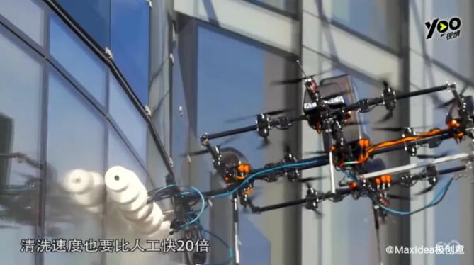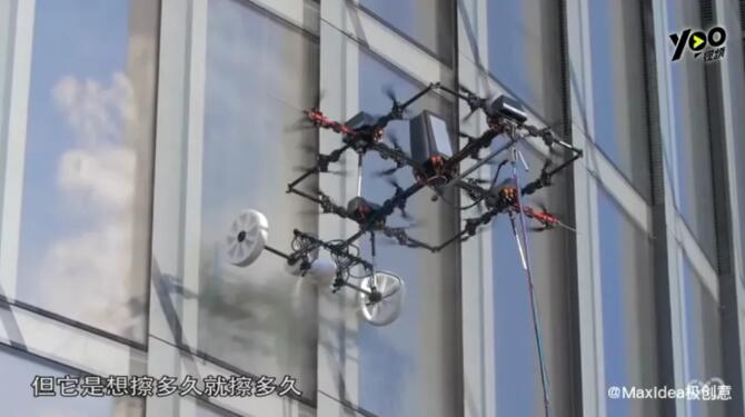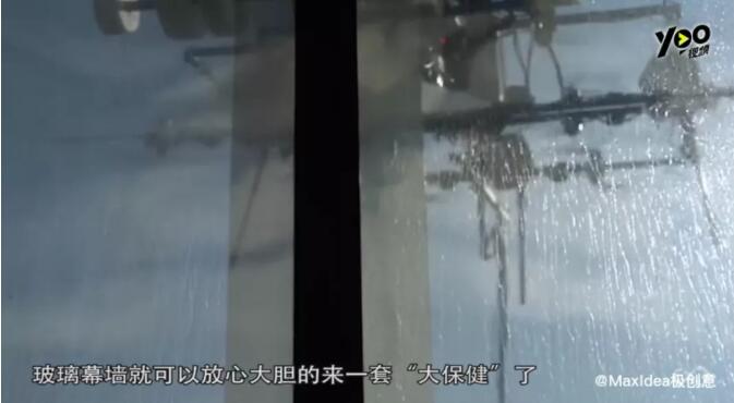▲無人機(jī)擦拭玻璃 輕松給玻璃幕墻來一套大保健 “蜘蛛人”有可能要失業(yè)了