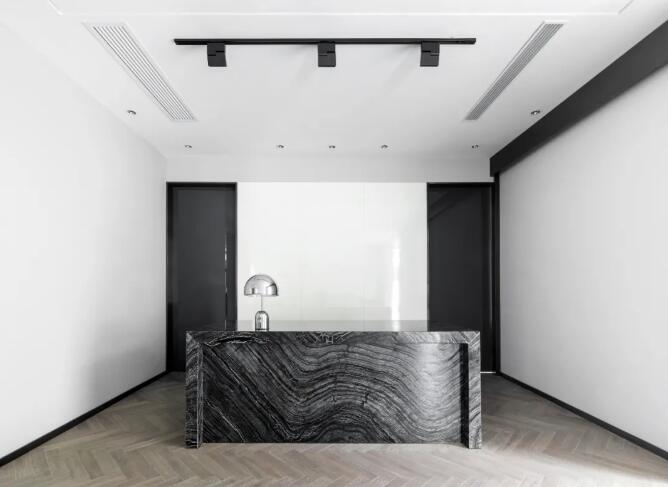 翡翠林梢青黛山,碧紗窗外水挪藍(lán),淺色的空間融入灰綠色的軟裝,建筑與室內(nèi)的氣質(zhì)彌漫開來。定制的麂皮絨沙發(fā),鏡面金屬和白色石材拼接而成的茶幾,藝術(shù)感彰顯無遺。黑色漸變玻璃隔墻,既是背景墻又是空間顏色最深的立面,讓茶水間在保持通透的同時又保證會客區(qū)客人的私密性。壁爐,火焰,回歸自然的同時讓氛圍變得輕緩,香茗與咖啡,讓辦公空間散發(fā)著靈魂的香氣。