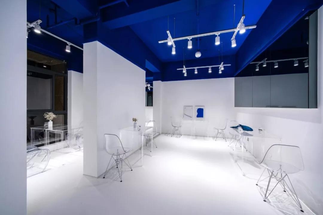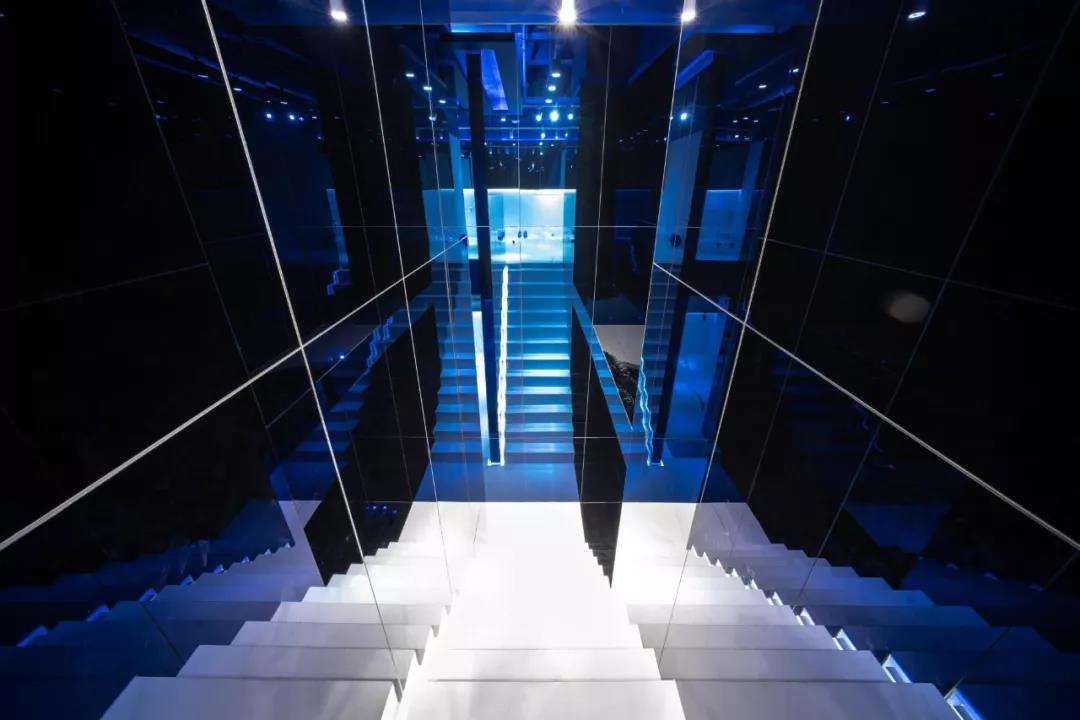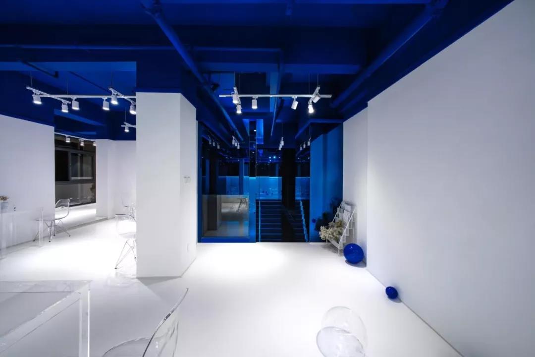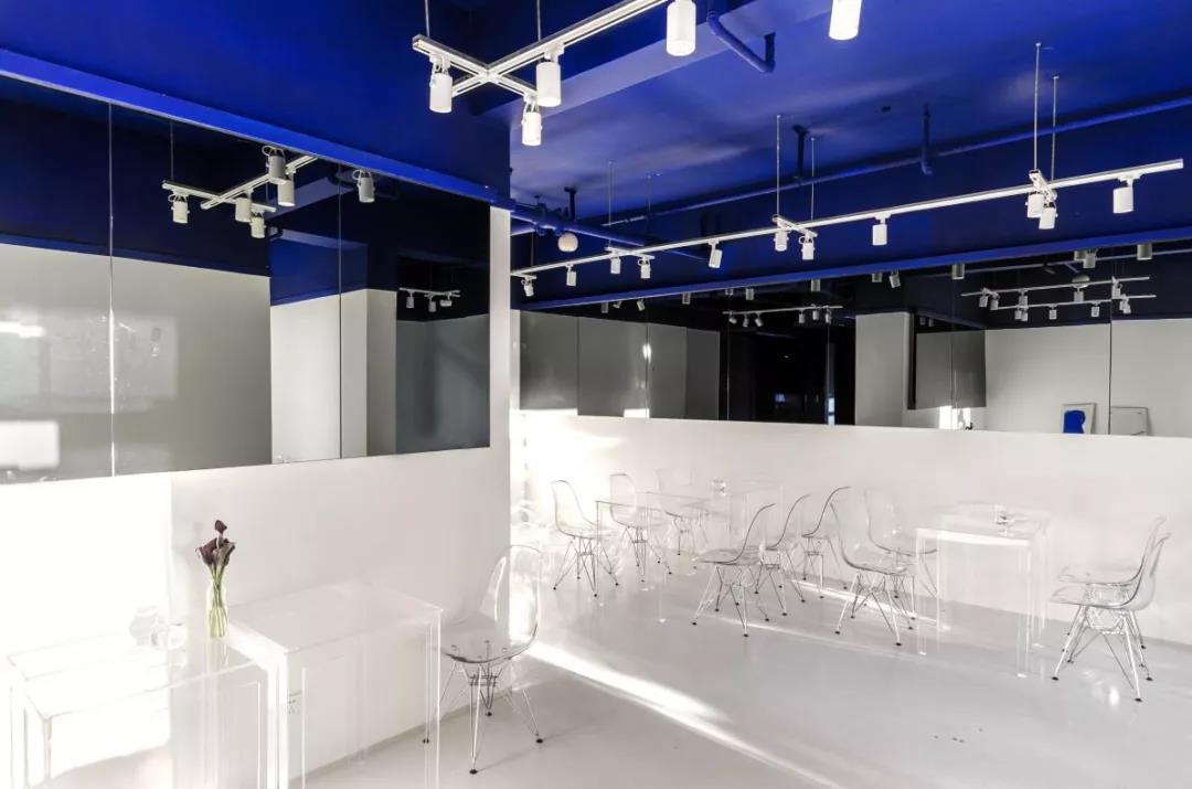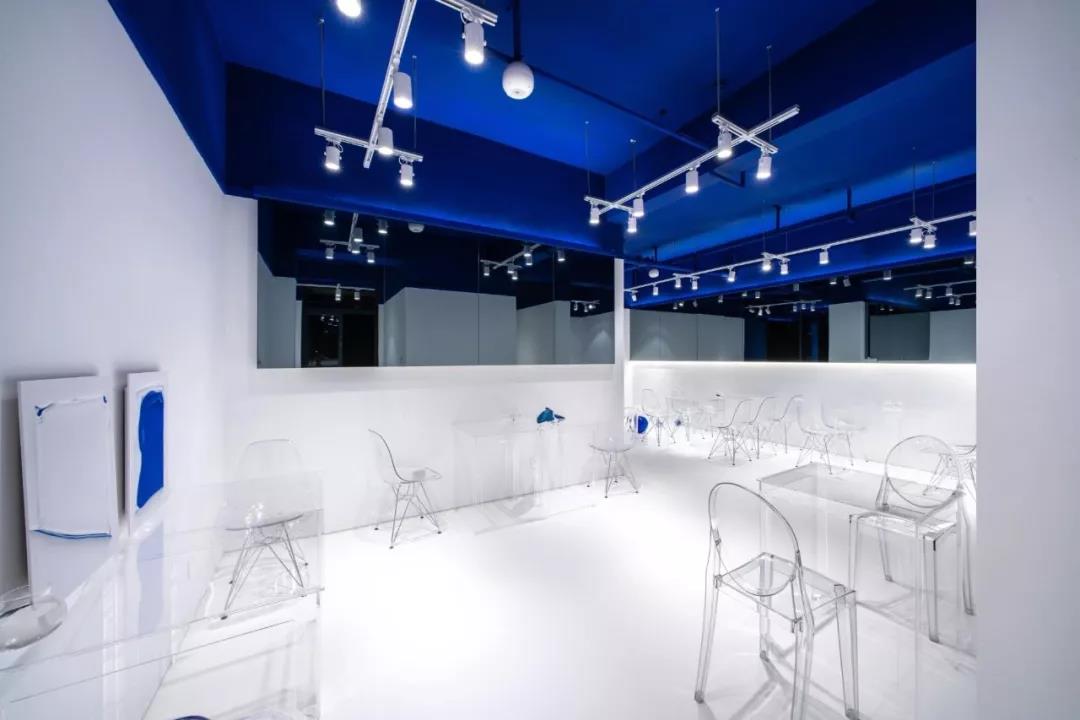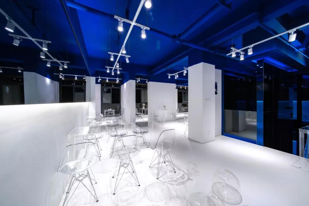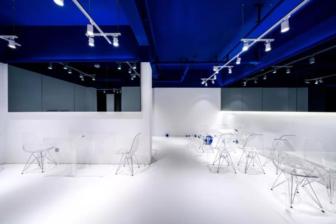 帶著這樣的邏輯,整個(gè)空間的設(shè)計(jì)就很明確了,拆除原有的吊頂,用涂料做成藍(lán)色的“天空”;下面的空間則使用帶有反射性/透明性的材料——鏡面、金屬、亞克力、塑料等,通過(guò)這種曖昧的委婉的,而非簡(jiǎn)單粗暴的方式,讓深海的藍(lán)色充滿整個(gè)空間。