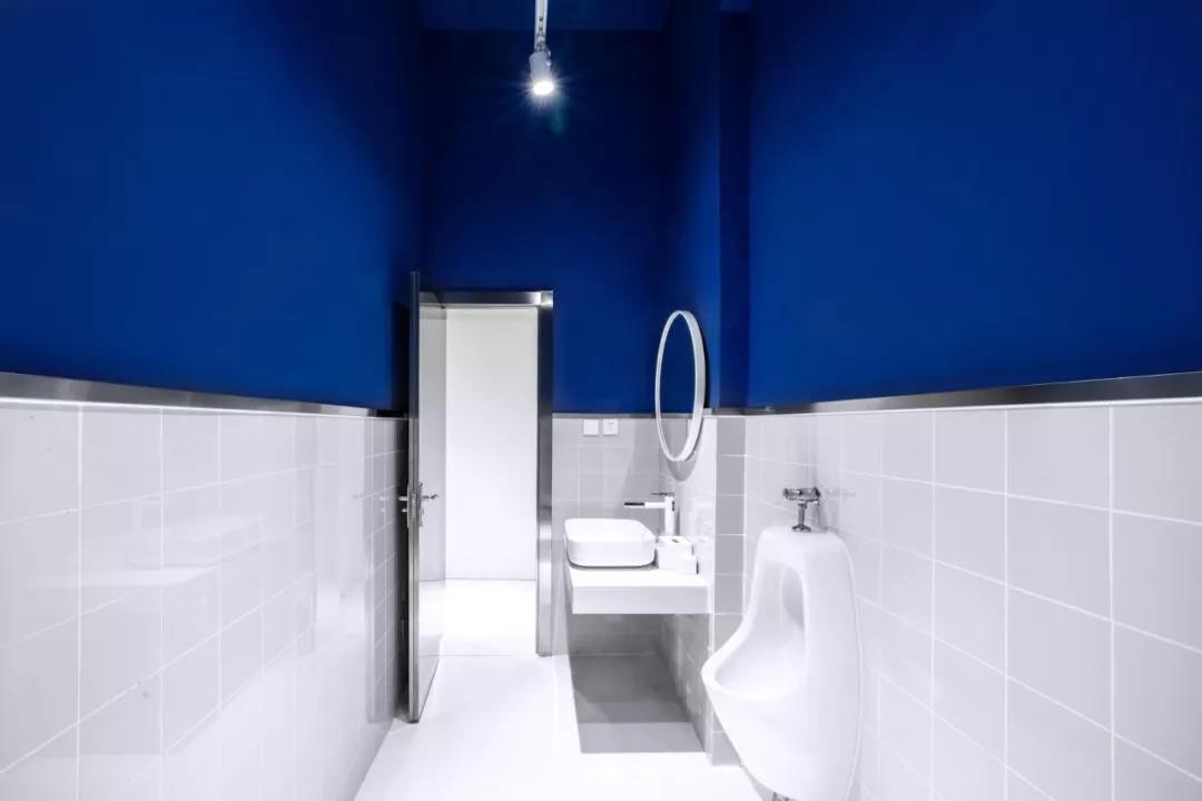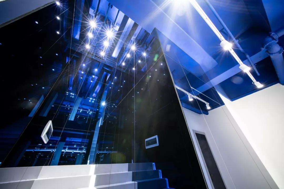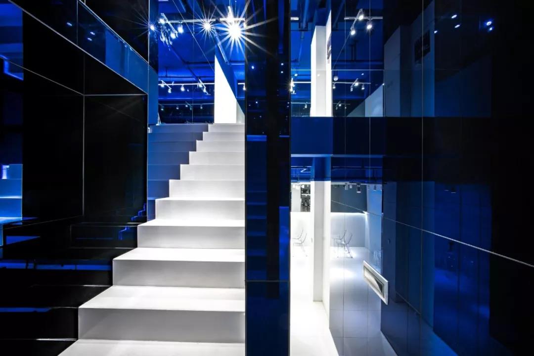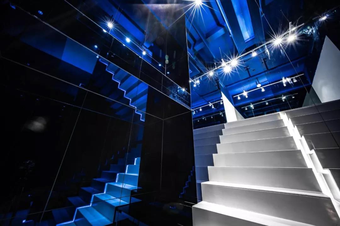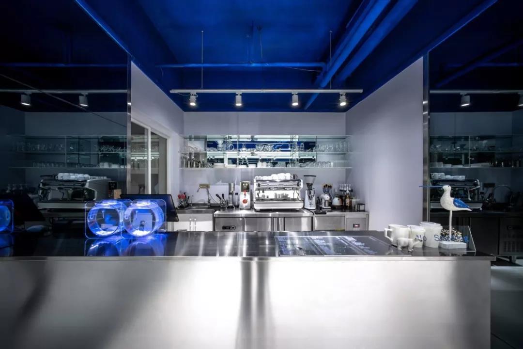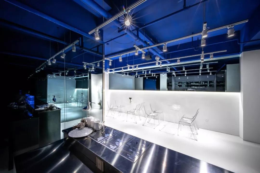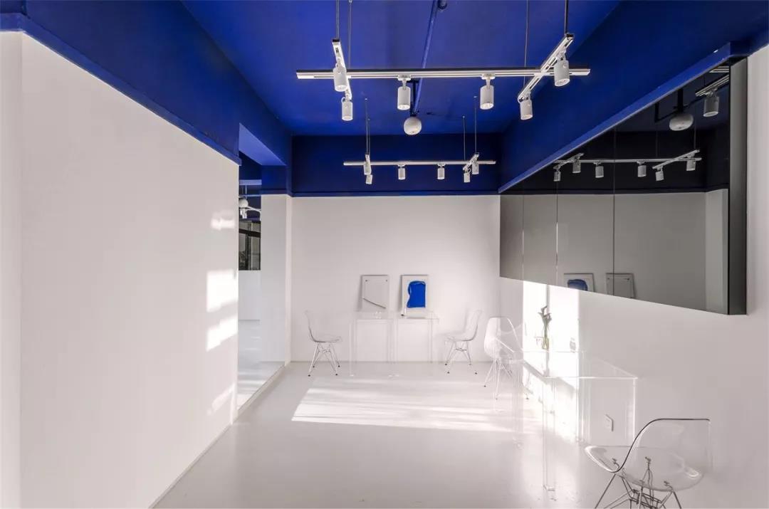帶著這樣的邏輯,整個(gè)空間的設(shè)計(jì)就很明確了,拆除原有的吊頂,用涂料做成藍(lán)色的“天空”;下面的空間則使用帶有反射性/透明性的材料——鏡面、金屬、亞克力、塑料等,通過(guò)這種曖昧的委婉的,而非簡(jiǎn)單粗暴的方式,讓深海的藍(lán)色充滿整個(gè)空間。
