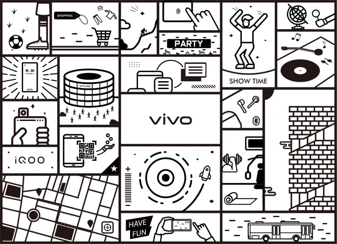 咖啡廳翻轉(zhuǎn)板設(shè)計(jì)的插畫,由vivo手機(jī)不同的使用場(chǎng)景組成,傳達(dá)品牌精神。