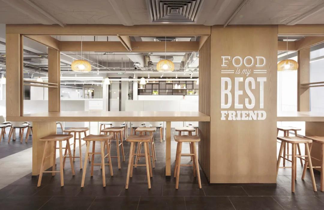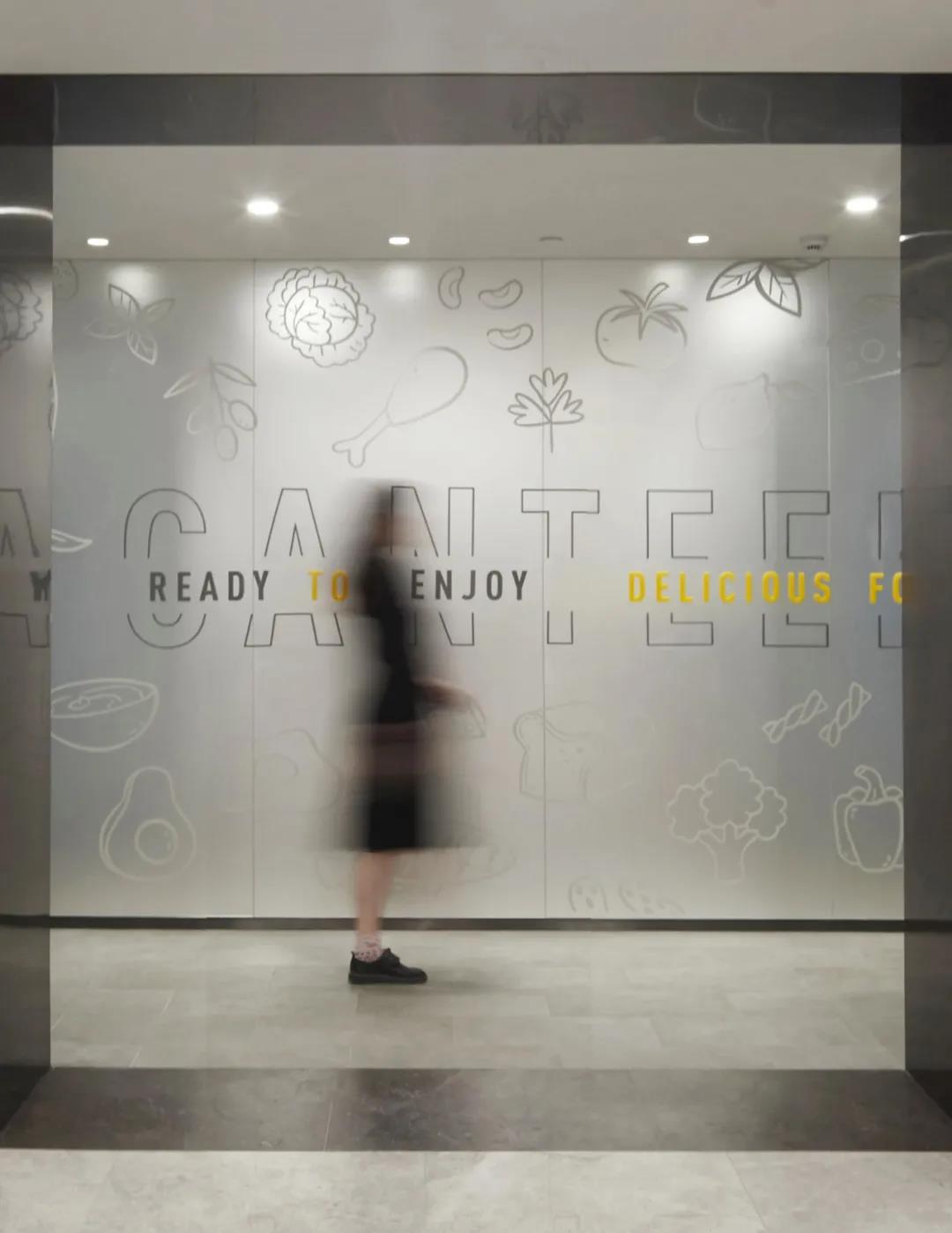 不同于其他辦公樓餐廳布置在地下層,vivo以三層作為生活服務(wù)區(qū),集中布局健身和餐廳,方便管理并對(duì)其他辦公層影響較少。餐廳入口使用磨砂鏡彩繪圖案,指示清晰,內(nèi)部通過地面鋪磚、桌椅組擺等方式設(shè)置出等候,取餐,就餐,收盤等交通動(dòng)線,維護(hù)空間秩序,營(yíng)造出輕松舒適整潔的就餐環(huán)境。