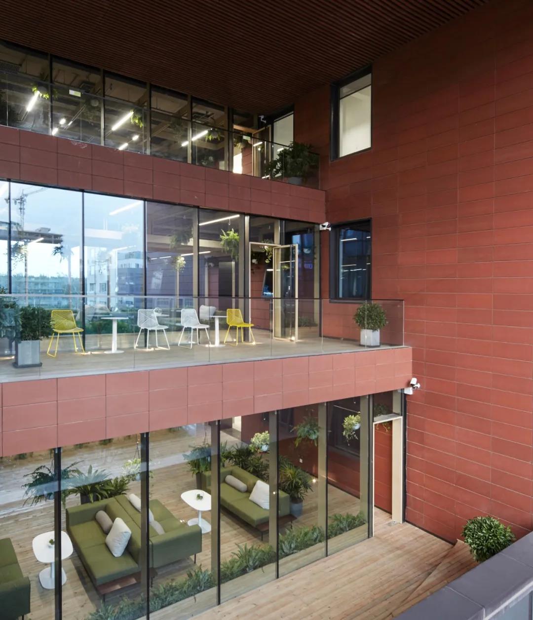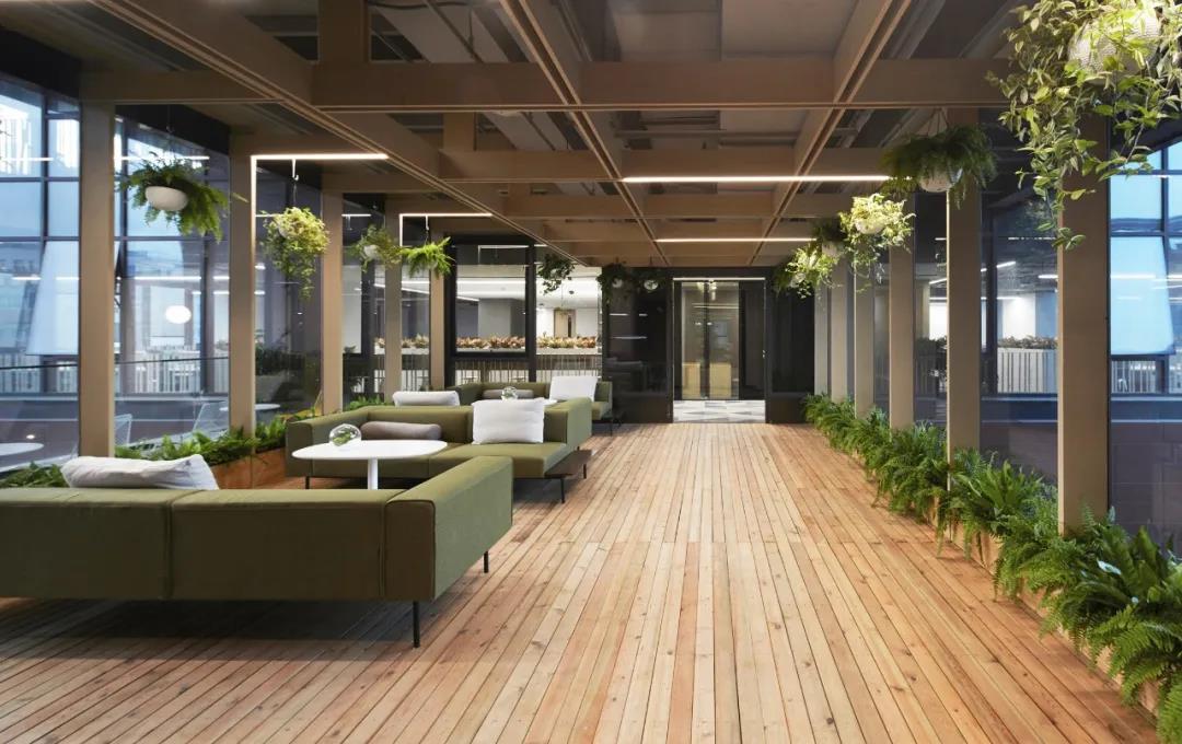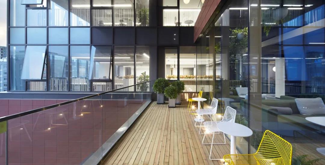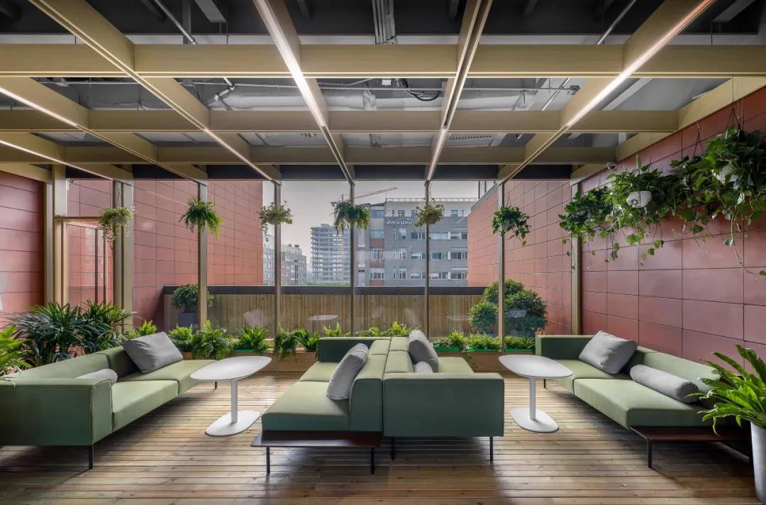 在建筑中段的4-6層,是一處半室外的連橋空間。通過結(jié)構(gòu)適度改造營(yíng)建了三個(gè)疊落的空中花房,同時(shí)每個(gè)花房都配有戶外露臺(tái)作為空間延展。矩陣型木質(zhì)天花延伸到側(cè)墻并落地,地面鋪防腐木條,整個(gè)空間配備綠植,營(yíng)造輕松、生態(tài)的戶內(nèi)外休憩空間,同時(shí)還可作為研討,舉辦小型活動(dòng)的多功能空間使用。
