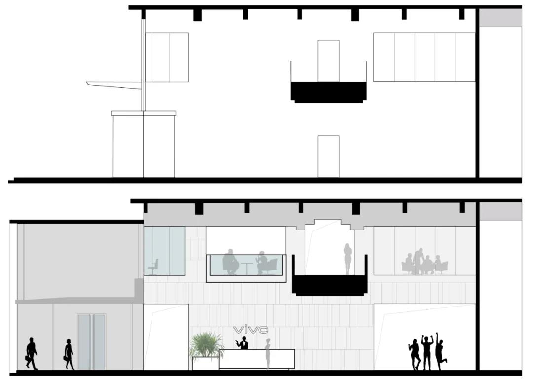 大堂作為整體的對(duì)外開放和形象展示空間,配備了咖啡,休閑茶水,展廳,洽談,會(huì)議等開放的功能性空間,配以圖像視覺傳達(dá)設(shè)計(jì),軟植入vivo品牌精神。