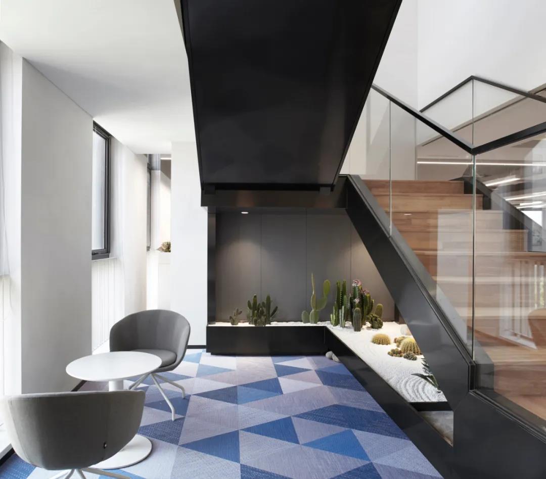 東側(cè)靠窗,面向花園的一面,布置休閑茶水區(qū),并打通部分樓層樓板,設(shè)步梯,促進(jìn)各部門之間交流,開展多場(chǎng)景辦公。