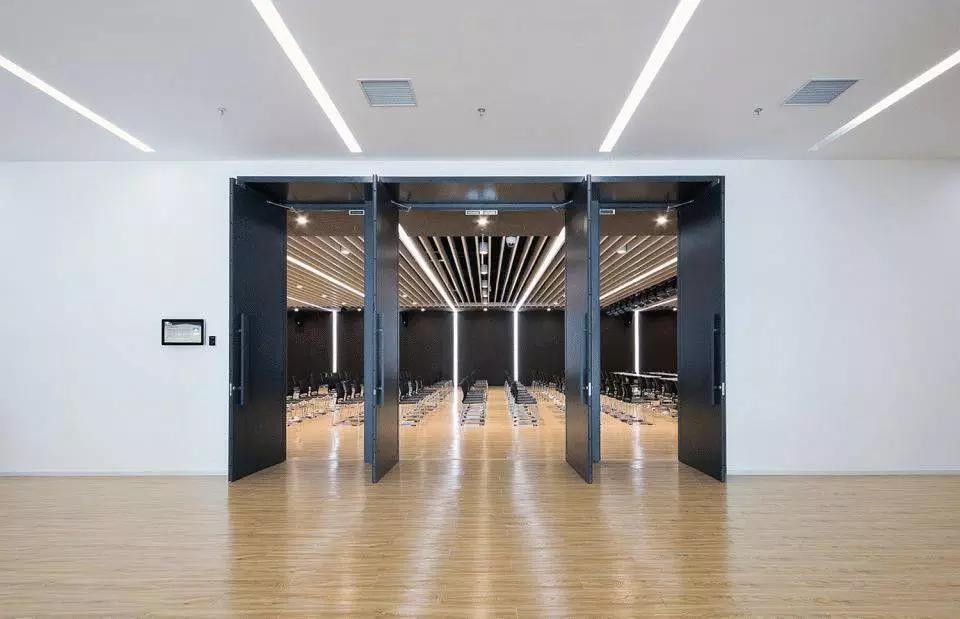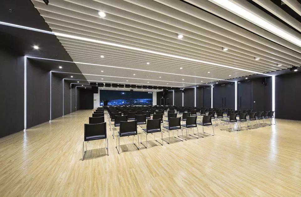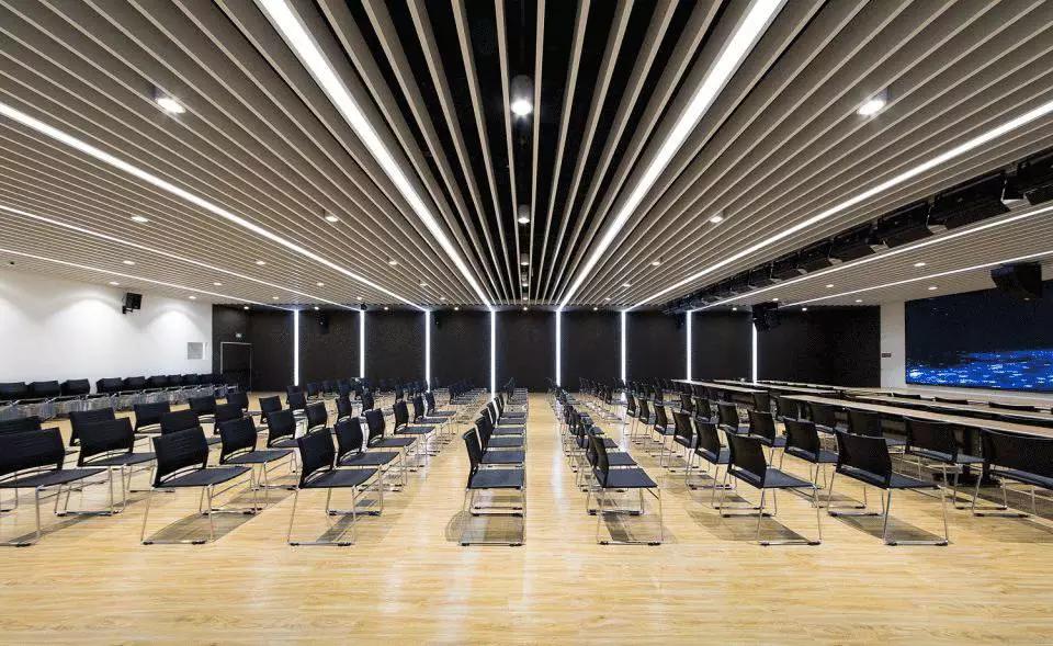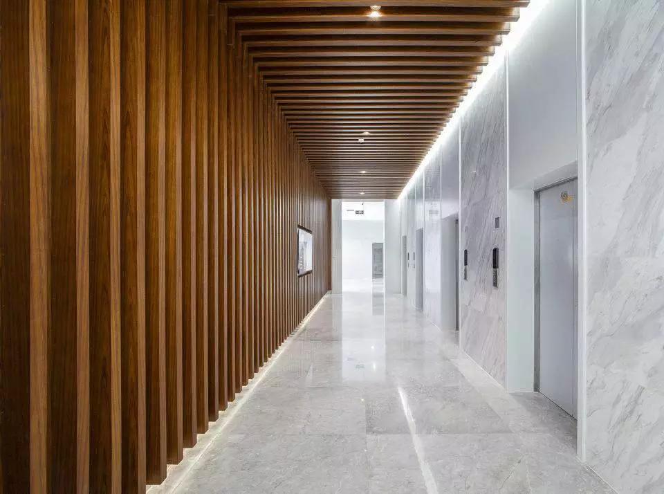 不同的空間內(nèi)容對(duì)應(yīng)不同的材質(zhì)氛圍,從色彩到質(zhì)感,再到意象化的裝飾,我們依據(jù)大堂、會(huì)議、休息室、中庭等不同空間尺度與空間內(nèi)容營造新穎豐富、恰如其分的空間氛圍。溫暖的木色、混凝土板、白色大理石和白色乳膠漆為主要材料,其中報(bào)告廳大異其趣,優(yōu)雅高貴的深灰色布藝軟包與報(bào)告廳的相對(duì)集中和封閉性相得益彰。我們依托原有建筑空間序列,如大堂-電梯廳-等候區(qū)-多功能廳-VIP室-展廳,調(diào)整改變室內(nèi)設(shè)計(jì)的溫度與濃度,為原本純功能理性化的空間組織蒙上一層魅力面紗,讓功能化的“經(jīng)過”變?yōu)橐淮尾簧岬鸟v留與感受。