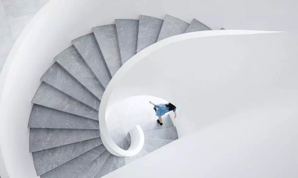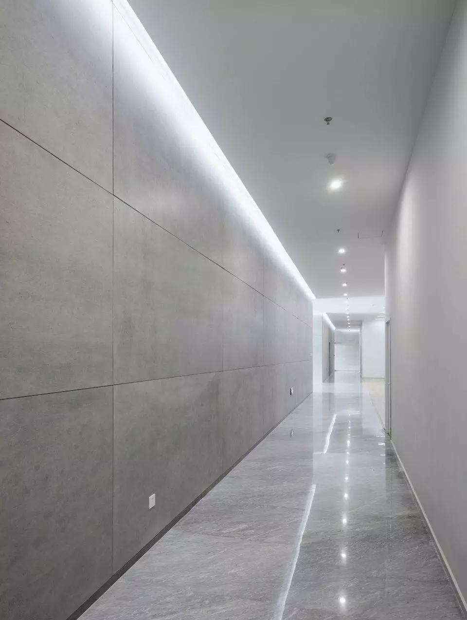 從中庭的自然光到室內(nèi)的人工光,大廈的光影在豁然開朗和細(xì)致入微之中不斷變換。中庭必須和天空有所交流,尤其是霧霾肆虐的今天,藍(lán)天顯得特別稀有,在中庭上方加蓋玻璃幕墻為上策。流空素影正翩翻,使得存在于強(qiáng)烈靜態(tài)空間體驗(yàn)中的人又能同時(shí)感受到光影與云卷云舒的動(dòng)態(tài)變化。在典型的辦公樓層,小型私人會(huì)議室從中庭立面懸挑而出,并錯(cuò)落有致,打破了中庭的單調(diào),并增加了最小辦公空間的面積。一側(cè)的螺旋樓梯飄逸靈動(dòng),用混凝土演繹出的獨(dú)特輕薄感如風(fēng)裳皎立,引辦公的人們靈感興發(fā)。
