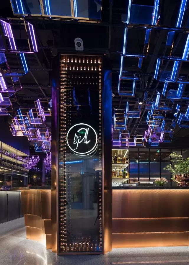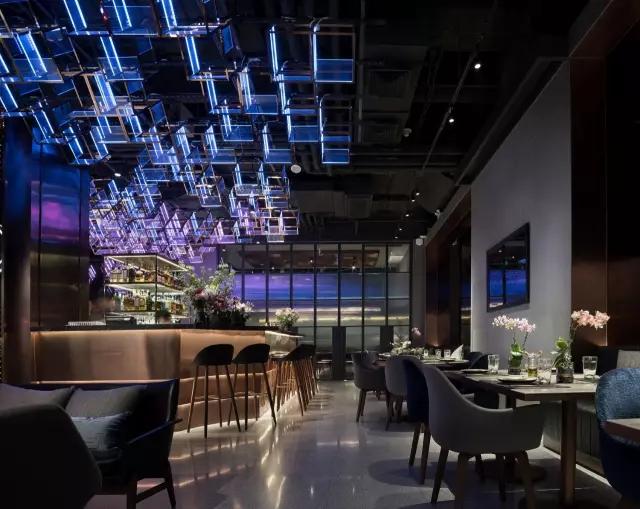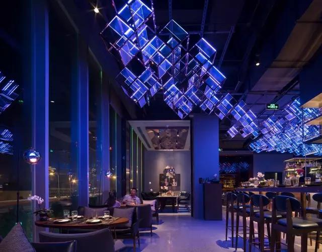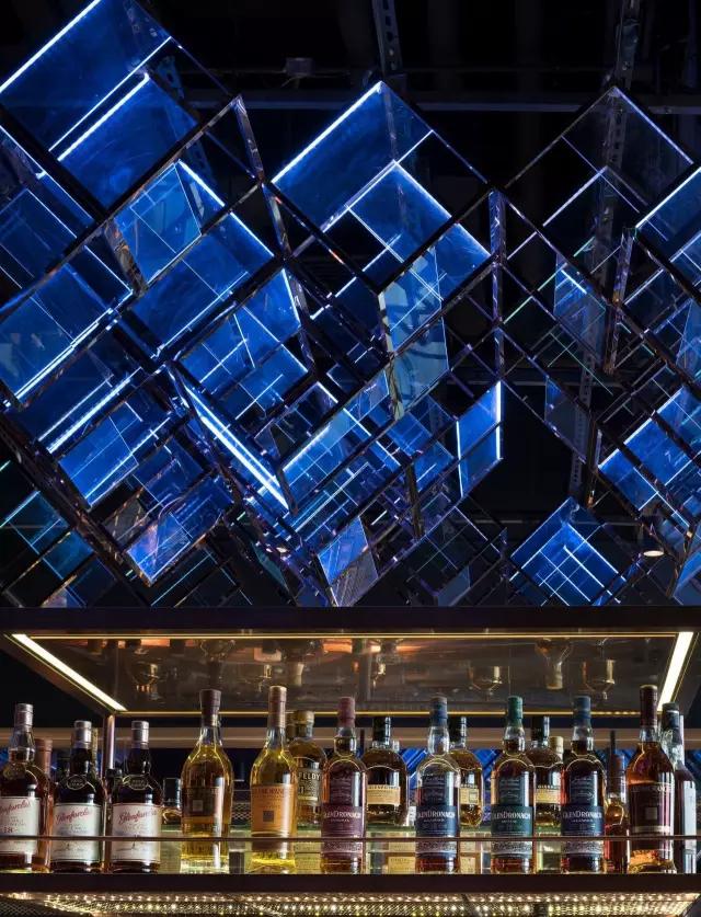 attabj意大利餐廳最美之處便是天頂上的藝術燈群,設計師通過抽象化、藝術化的手法,將這一感官體驗濃縮為空間當中的一組裝置,透明亞克力單元體如同酒杯內的冰塊,而不斷變幻的LED燈光就像是色彩斑斕的酒體,兩者相互反應形成夢幻迷離的光影效果。