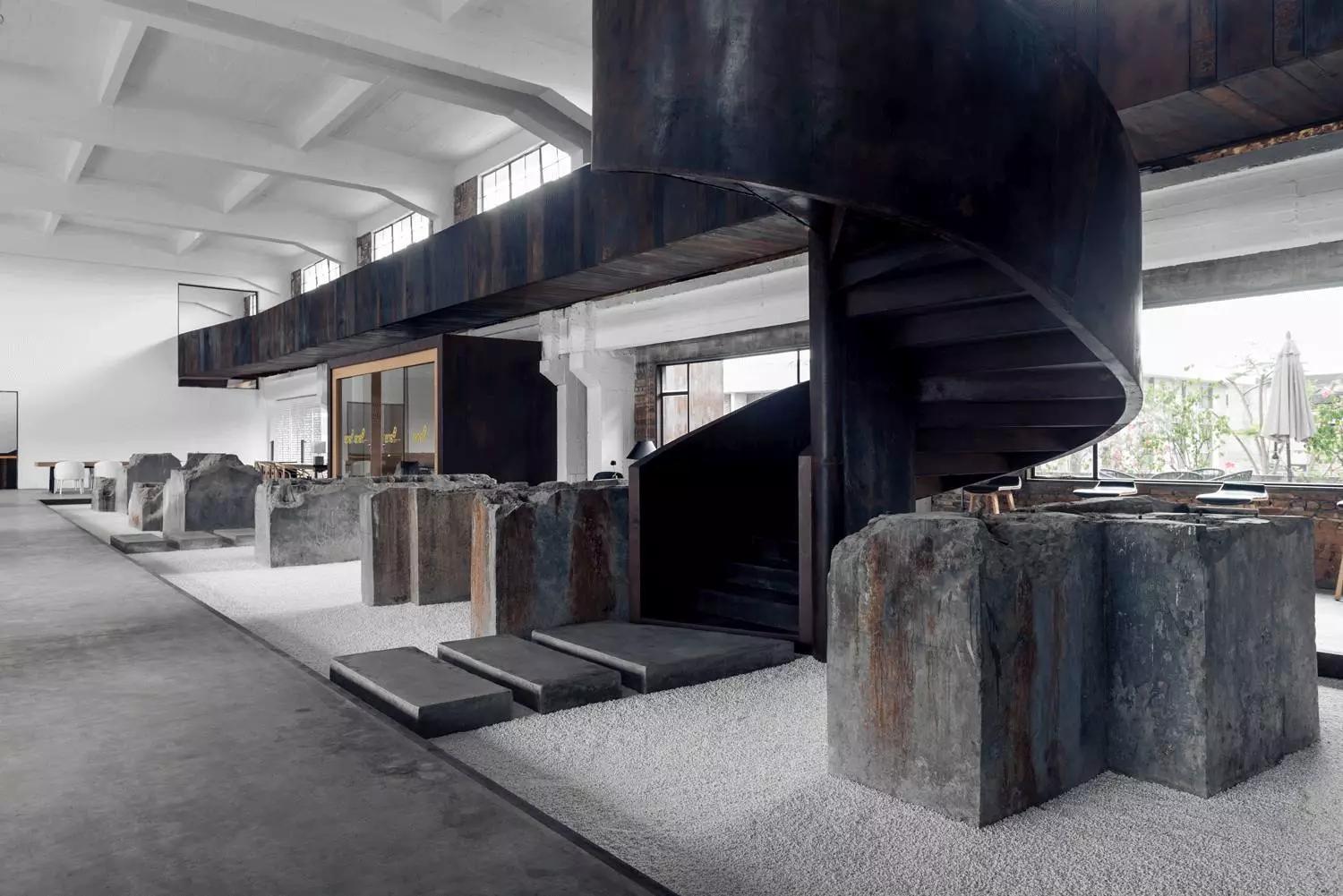 群組辦公空間保留的舊石墩是場所精神的集中體現(xiàn),正是它,喚起了空間裡地方風(fēng)貌的意象。