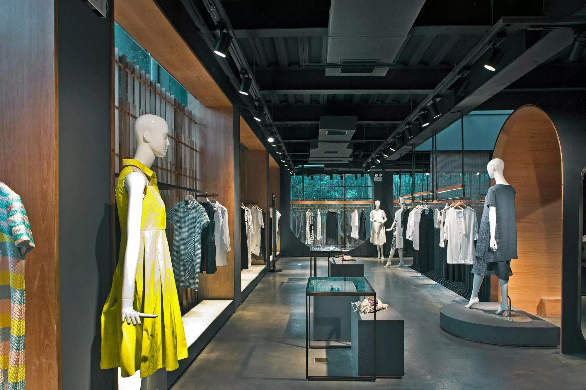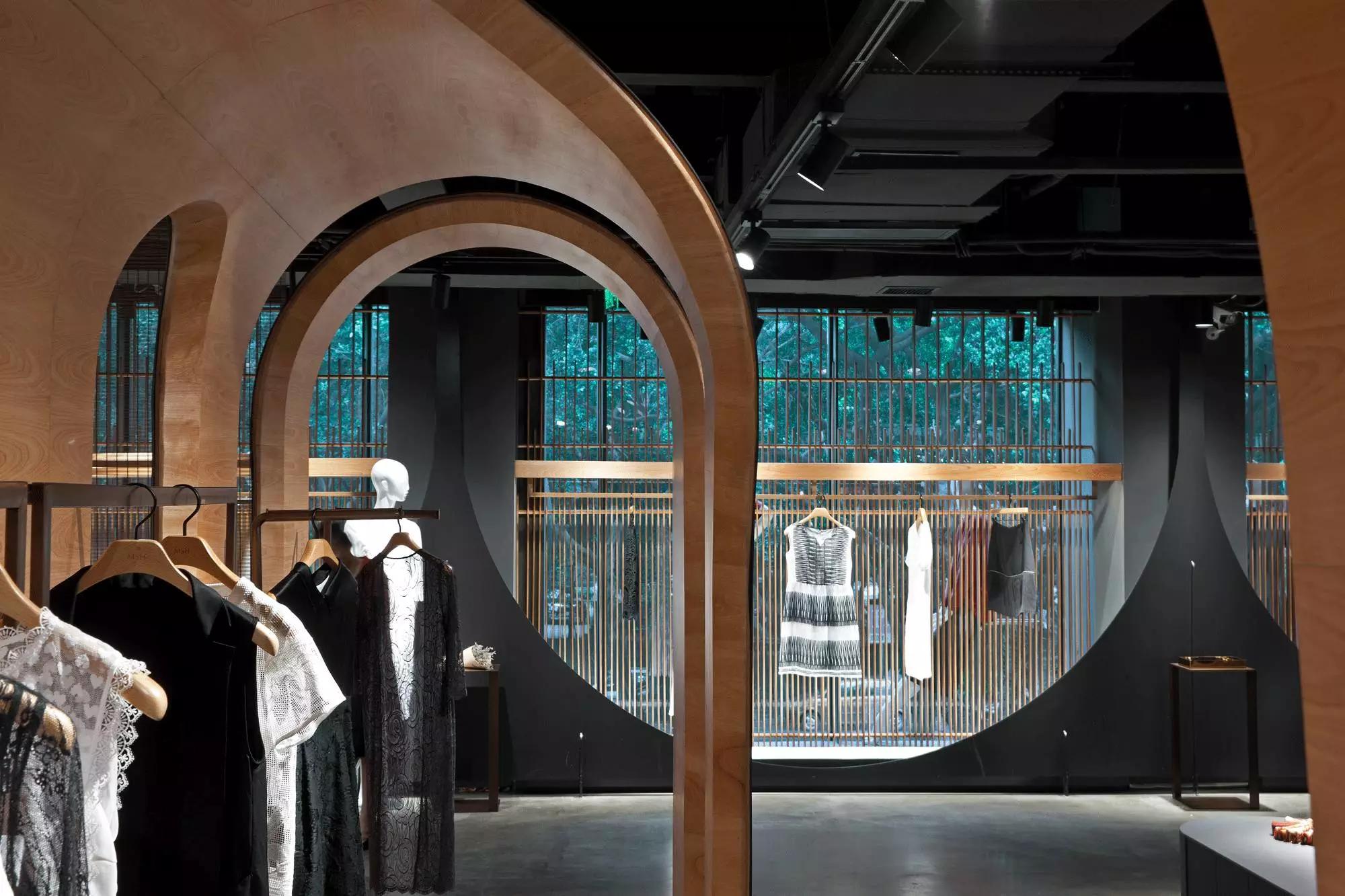和一般常規(guī)服裝店陳列的概念不同,新的店鋪概念強(qiáng)調(diào)建筑化的零售模式。纖細(xì)的木屏風(fēng)結(jié)合貨架矗立在邊界處,渲染了空間和室內(nèi)飾面的豐富多樣性,建筑元素顯露材質(zhì)原始的質(zhì)感,烘托服裝的品質(zhì),這種手法為整個(gè)店鋪灌注純粹的氣氛,隱喻品牌的精神。天井樓梯釋放出不同光影效果,使整個(gè)空間與建筑取得一種時(shí)間與空間的對(duì)話。設(shè)計(jì)中,我們直白的將不同的“拱”垂直交疊,希望在垂直空間上制造不同的空間與體驗(yàn)。這個(gè)特殊的表現(xiàn)方式給人們提供強(qiáng)烈的視覺(jué)效果。依據(jù)商業(yè)需求,采用模塊式設(shè)計(jì),這樣可以使品牌不同功能具有最大的靈活性。