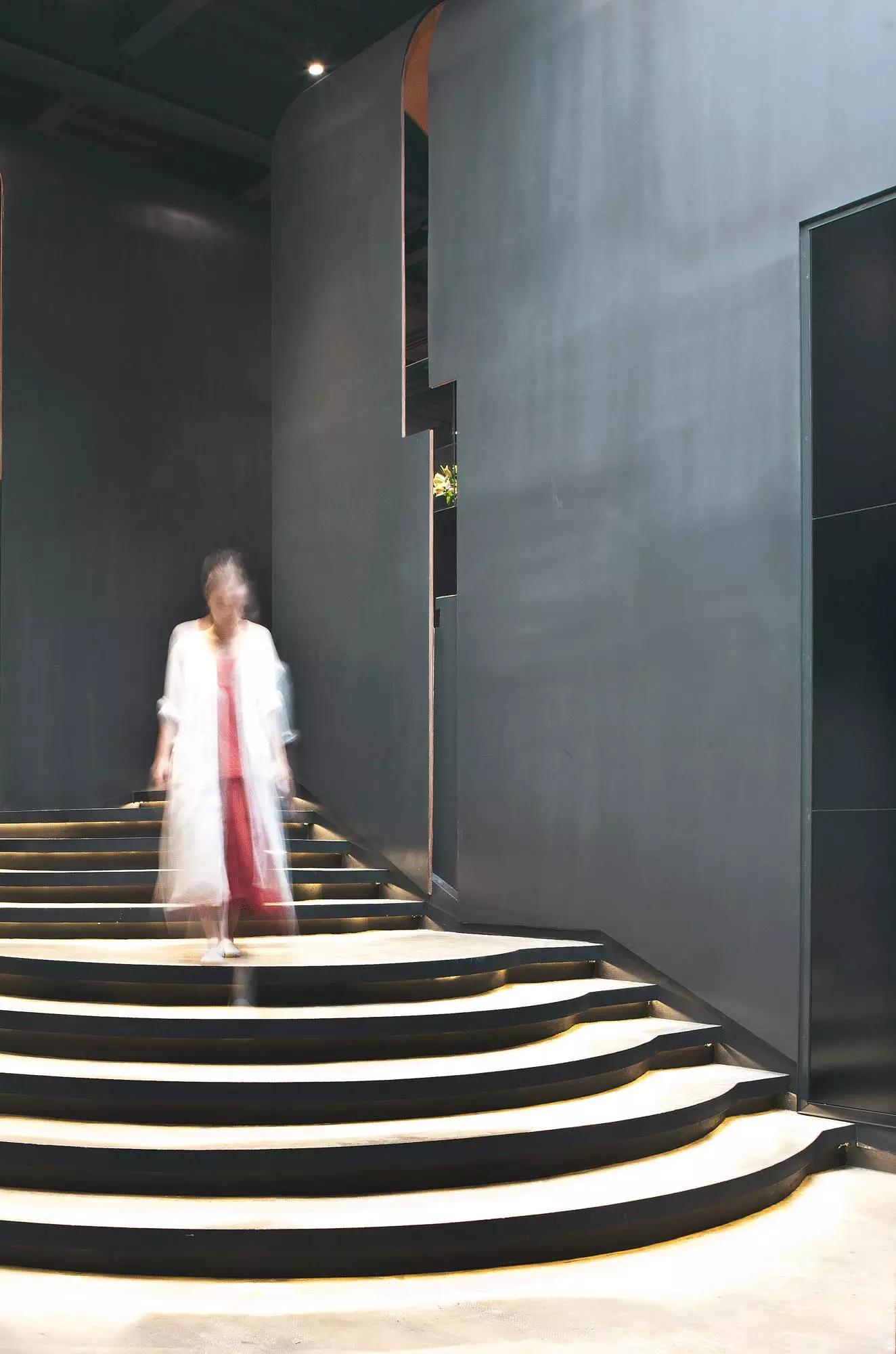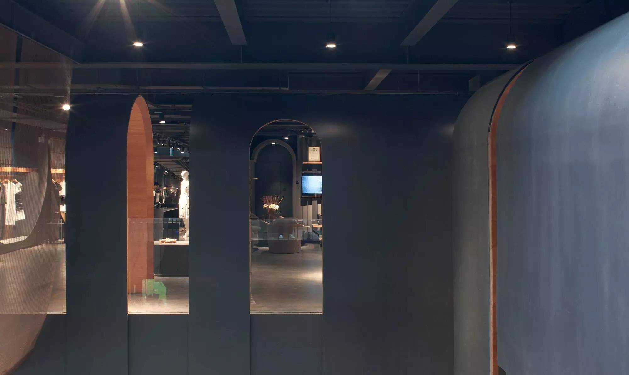 內(nèi)部空間希望呈現(xiàn)一種原始野性的魅力,采用鋼制的表皮帶來(lái)一種現(xiàn)實(shí)感。這種“直白”式的架構(gòu)材料,空間所形成的直接性與樸素性,加上大尺度的鋼板落地產(chǎn)生的力量感或輕盈感,使整個(gè)空間與原有場(chǎng)地建筑取得一種時(shí)間與空間的接續(xù)關(guān)系。利用“拱”多變的空間特性,產(chǎn)生不同的空間,打破了均質(zhì)的體驗(yàn)。這是一個(gè)回憶的過(guò)程,再一次將建筑的體量與空間對(duì)話,越是簡(jiǎn)單的形體邏輯,越能給人帶來(lái)深刻的印象,弧拱曲線柔和,呈現(xiàn)不同角度的美感。弧拱的連續(xù)曲線把空間構(gòu)造成圍合區(qū)域,在這樣的方式下,內(nèi)部和外部保持著空間的連續(xù)性,這個(gè)理念使空間不拘泥于常規(guī),探索傳統(tǒng)類型空間的新秩序,"拱"在傳統(tǒng)建筑中扮演重要角色,并且在漫長(zhǎng)的歷史中不斷豐富。我們?cè)噲D轉(zhuǎn)化傳統(tǒng)"拱",讓"拱"在均質(zhì)呆板的現(xiàn)代空間上制造新的突破,獲得自然能量并把它轉(zhuǎn)化為空間秩序。濃烈的空間美感,顯示該品牌的重要意義?;」巴臻g一、二層相連,創(chuàng)建出有趣的空間狀態(tài),吸引顧客的好奇心。