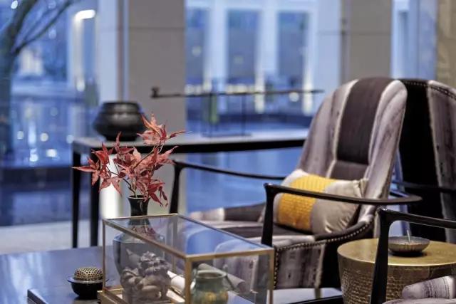 玻璃窗外,暮色朦朧氤氳中,充盈著自然的綠意,一處盆景,暖樹染綠,更添別樣情致。深色的金屬和皮革的質感,簡化形態(tài)的中式家具,香爐書卷,幾處綴花,穿越時空,對話古今。“到處皆詩境,隨時有物華”大抵如此。