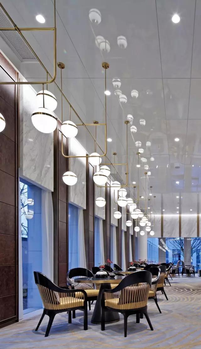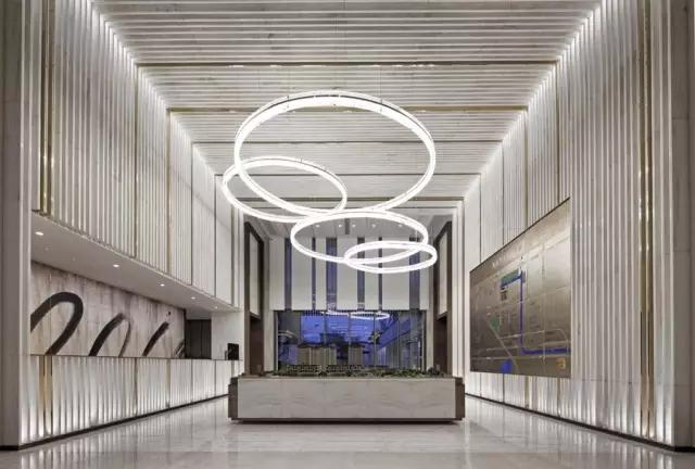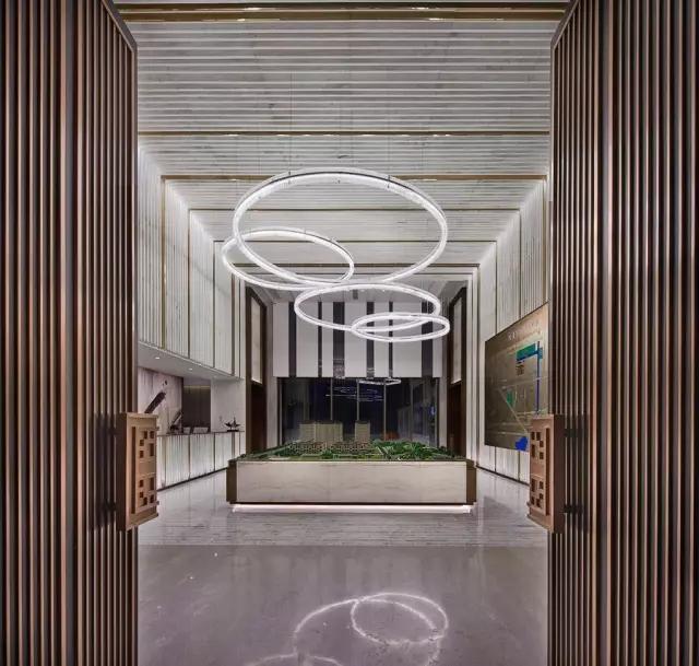 大型吊燈宛如運河之水泛起的漣漪,靈動唯美,抓人眼球。地面低調華麗的灰色大理石與之遙相呼應,古代先哲素有“天圓地方”之說,意境深遠的寫意格調翩然入室,整個空間滲透著典雅尊貴的氣派。