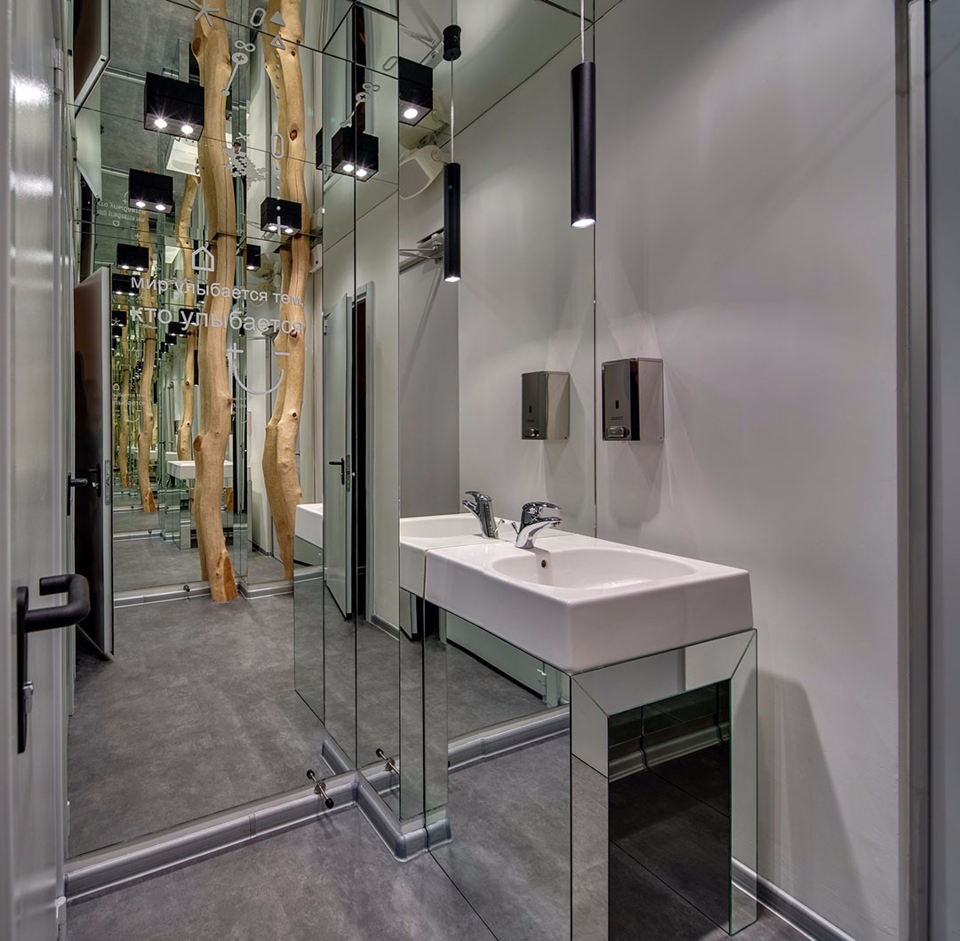 整個空間共有三層。一層空間將有照明的大型金屬logo面板緊貼玻璃樓梯圍欄設置,歡迎客人的到來,并通過動態(tài)照明來強調(diào)出長接待臺。